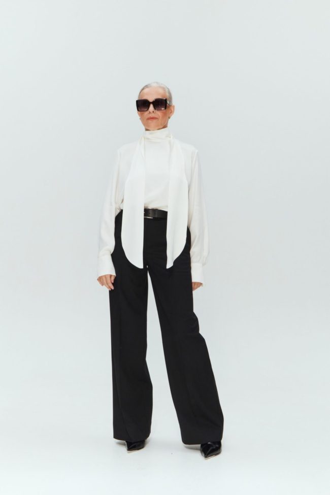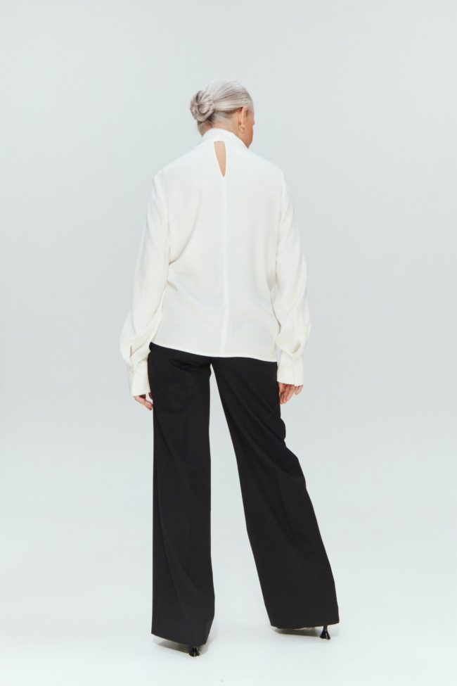 Блузка V|L, которая идеально подойдёт как для делового, так и вечернего образа. Выполнена из нежной струящейся вискозы, формирующей при движении мягкие драпировки. Элегантности модели добавляет широкий воротник-стойка с завязками сзади.