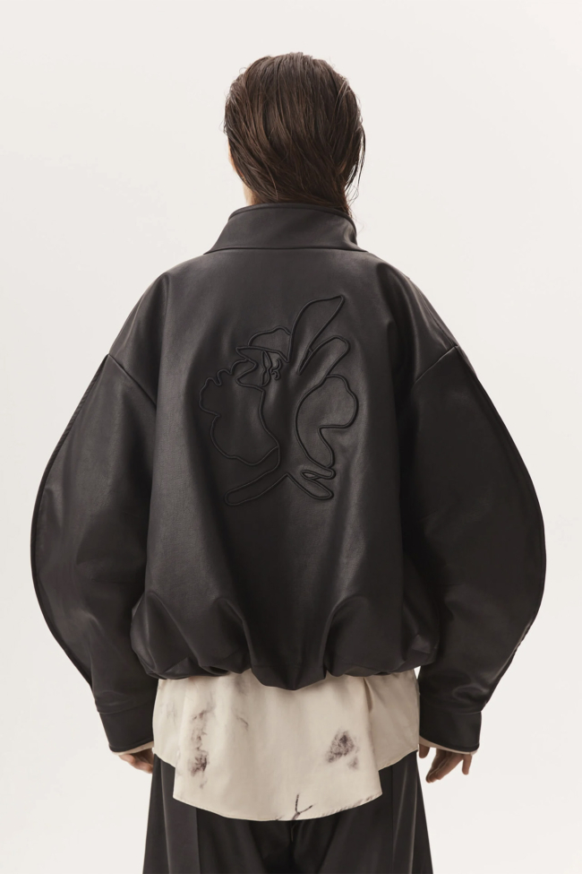 Это изделие легко комбинируется: с джинсами, кожаными брюками, юбками или платьями. Он может стать центральным элементом образа, особенно в монохромных или минималистичных сетах, где вышивка будет выделяться.