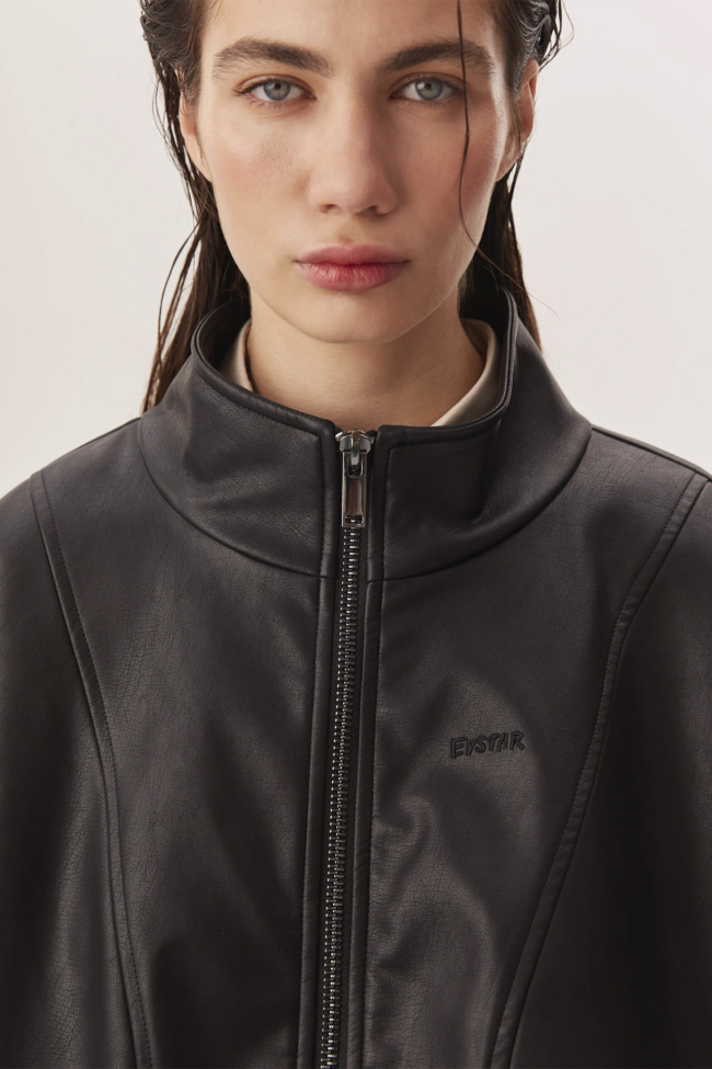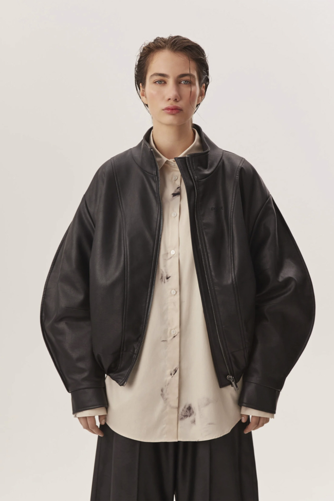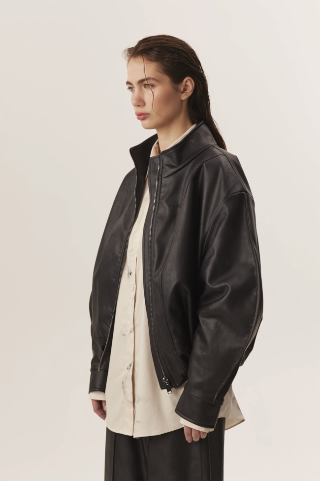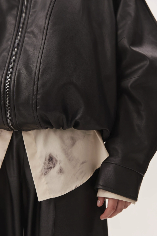 Внешне модель выполнена из эко-кожи в сочетании с тканью, а внутри — подкладка, утеплитель и вставки из вискозы. Это делает бомбер тёплым, стойким к ветру и погодным переменам, но при этом не слишком тяжёлым на теле. Внутренний утеплитель позволяет носить изделие при температурах до –5 °C — в межсезонье и в прохладные вечерние часы.