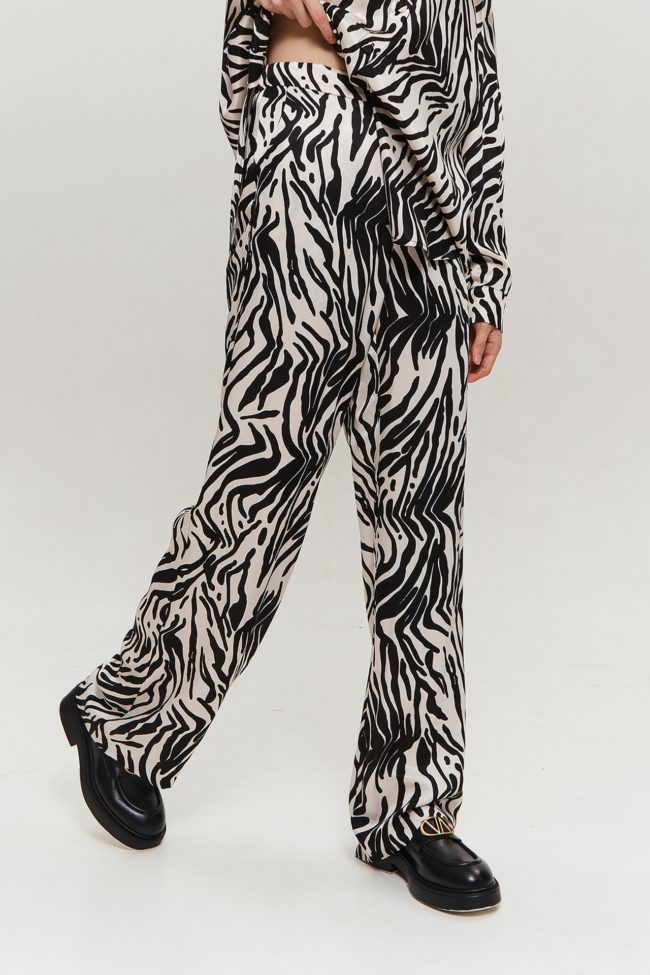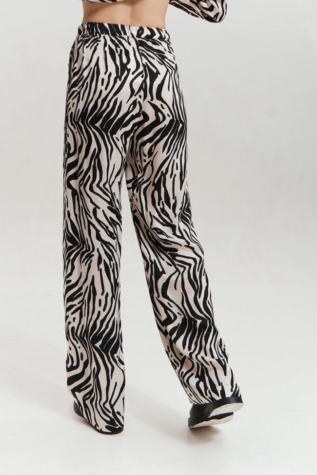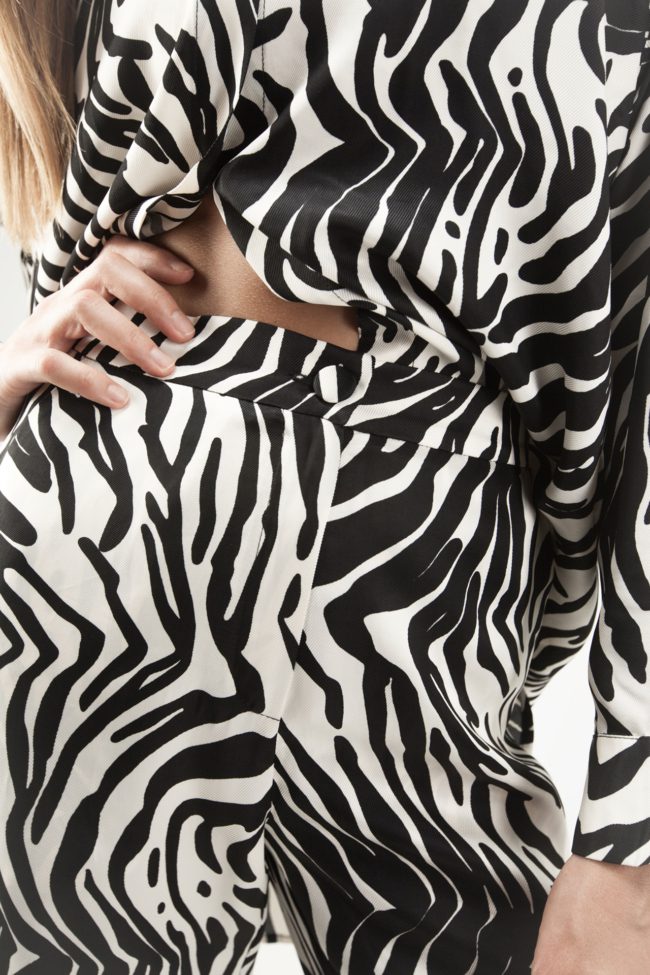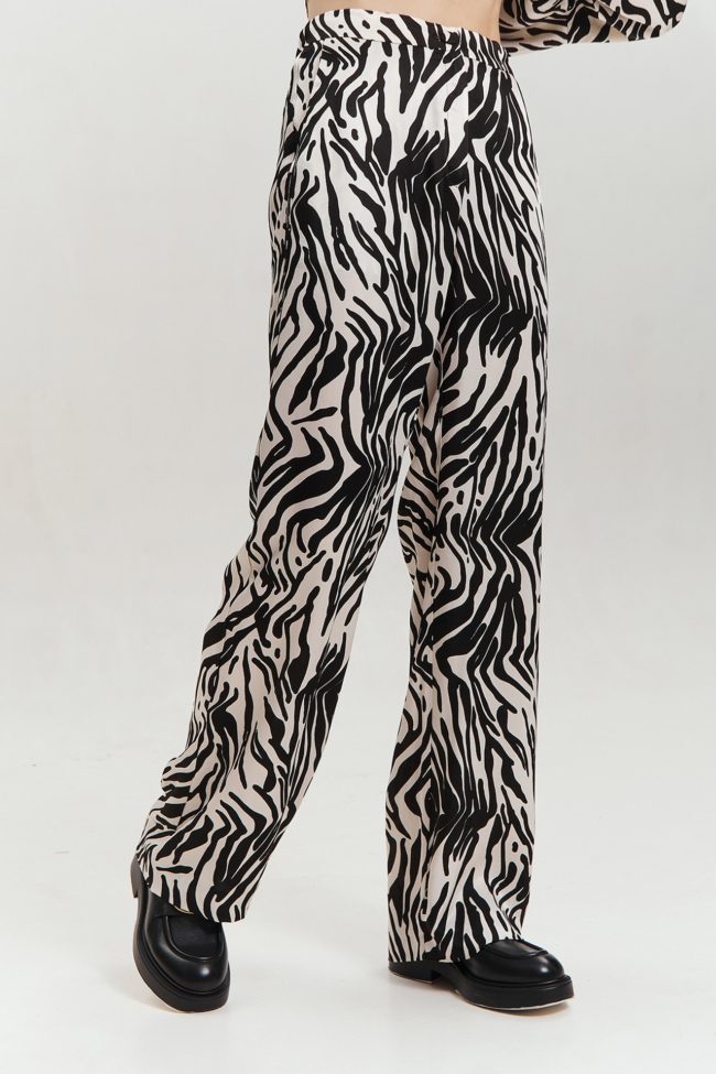 Брюки прямого кроя из натуральной итальянской вискозы. Ритмичная зебровая полоска – в последних трендах сезона. Подчеркнуто неровные линии визуально меняют силуэт и добавляют ему динамики, а черно-белая гамма помогает найти общий язык с одеждой любых оттенков.