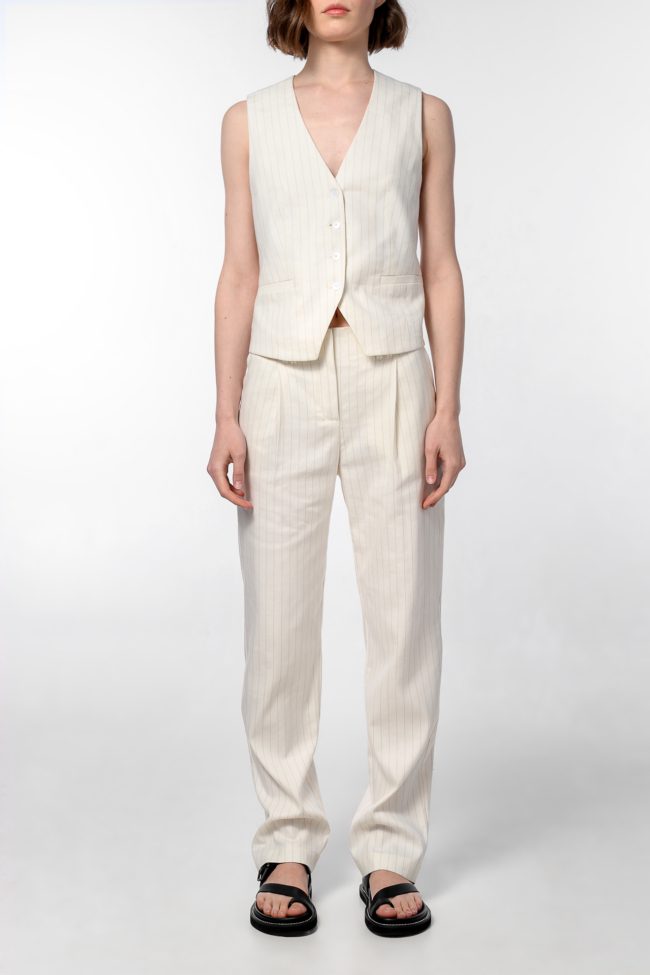 Брюки с заниженной посадкой – идеальный вариант для создания образа в стиле easy chic. Глубокие защипы спереди подчёркивают свободный силуэт изделия. Линия талии акцентирована широкими шлевками. Предлагаем превратить в эффектный комплект в сочетании с жилетом V|L.