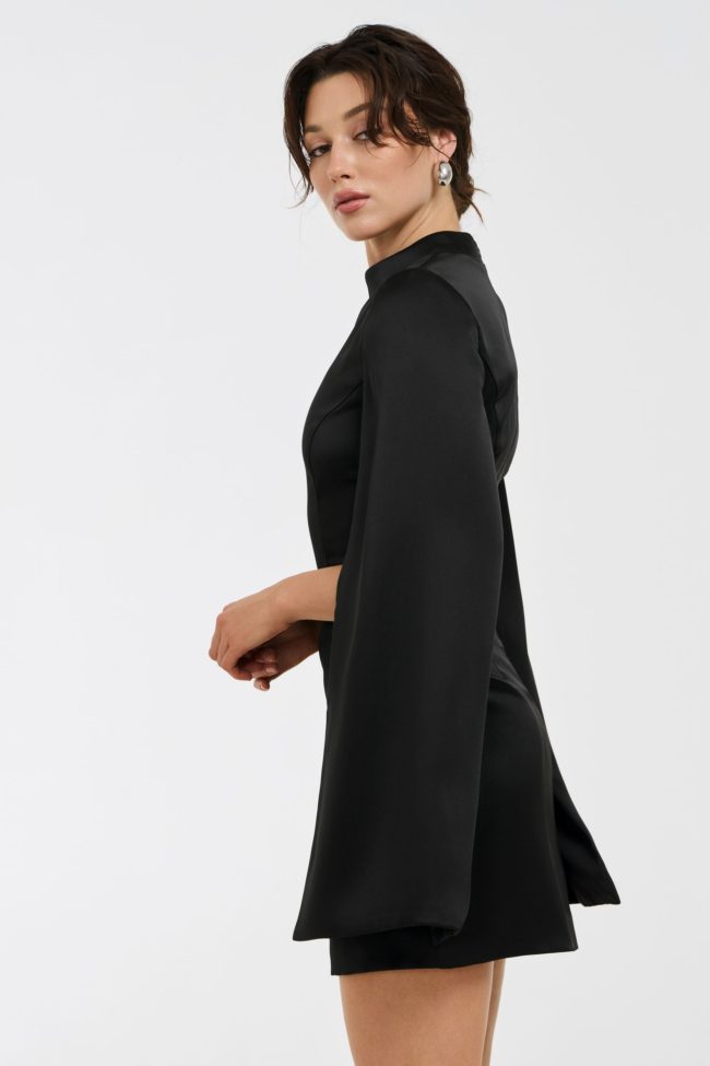 Мини-платье прямого кроя из гладкой ткани с высоким воротником и кейп-рукавами, создающими скульптурный силуэт. Элегантная длина, подчеркнутая талия, скрытая молния на спине. Благодаря минималистичному дизайну и идеальной посадке, модель легко впишется как в вечерний, так и в дневной образ. Сочетается с лаконичными серьгами, колготками с принтом или обувью на каблуке.