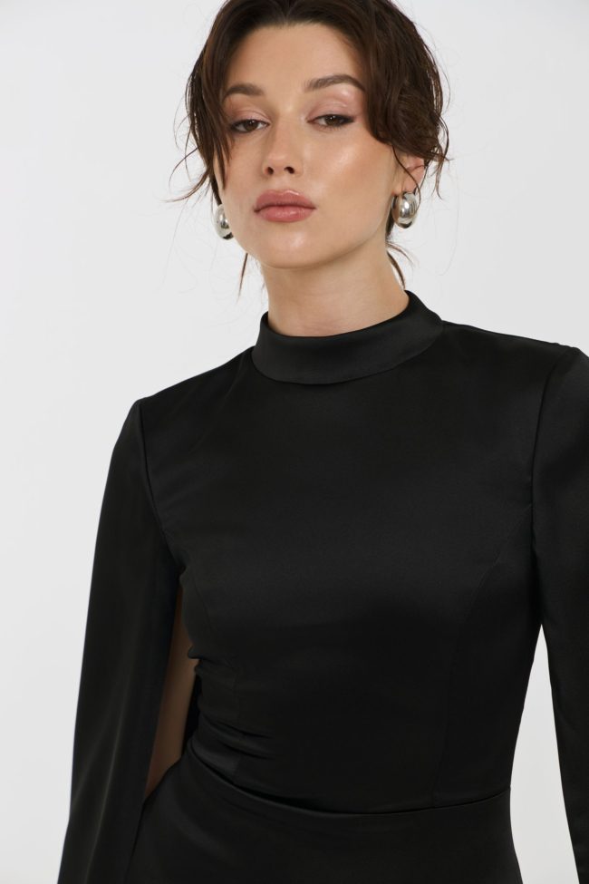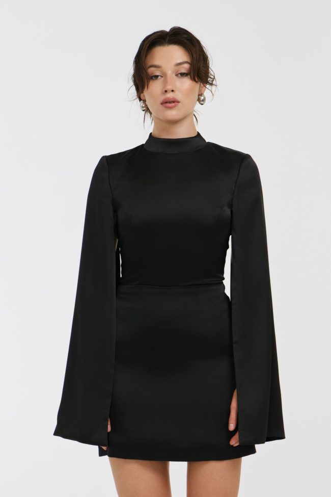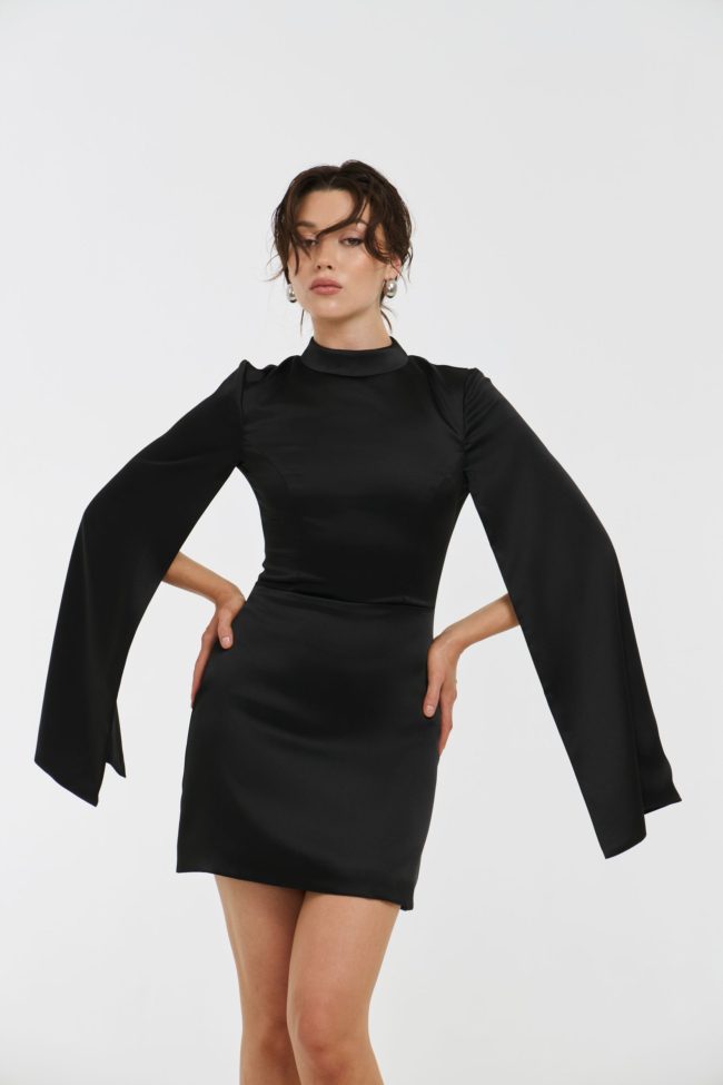 Платье AB Anastasiya Burdyugova чёрное с кейп-рукавами — лаконичная мини-модель с архитектурным силуэтом и сатиновой фактурой.