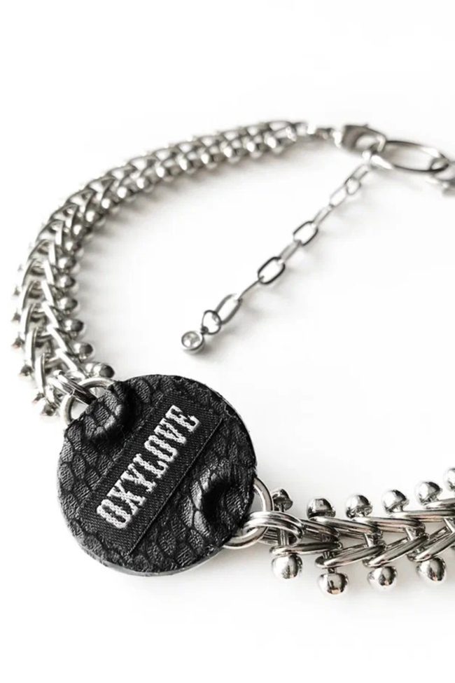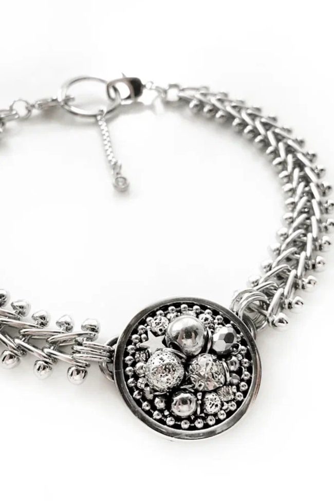 Украшение из крупных фигурных звеньев, которое автоматически приковывает к себе взгляды. В центре внимания – круглая подвеска, собранная ювелиром Окси вручную и вышитая камнями Swarovski, гематитом и бусинами из стекла.
