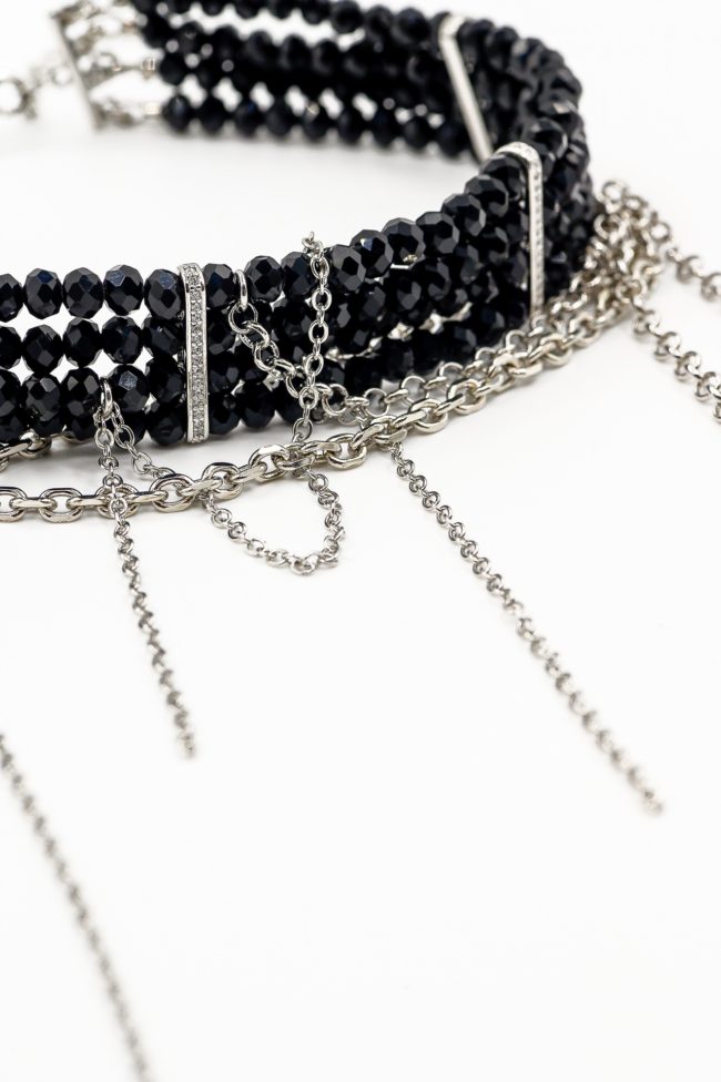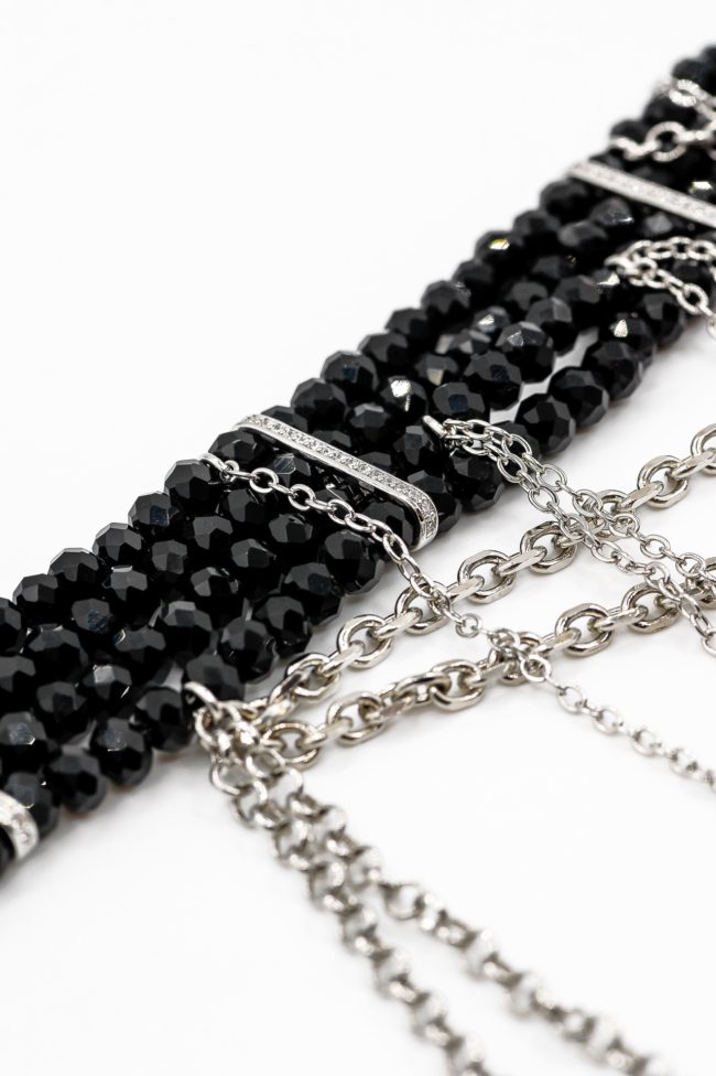 Чокер-стойка BIJU BLESK из черного ювелирного стекла с перемычками, инкрустированными фианитами. Дополнено каскадами тонких цепей.
