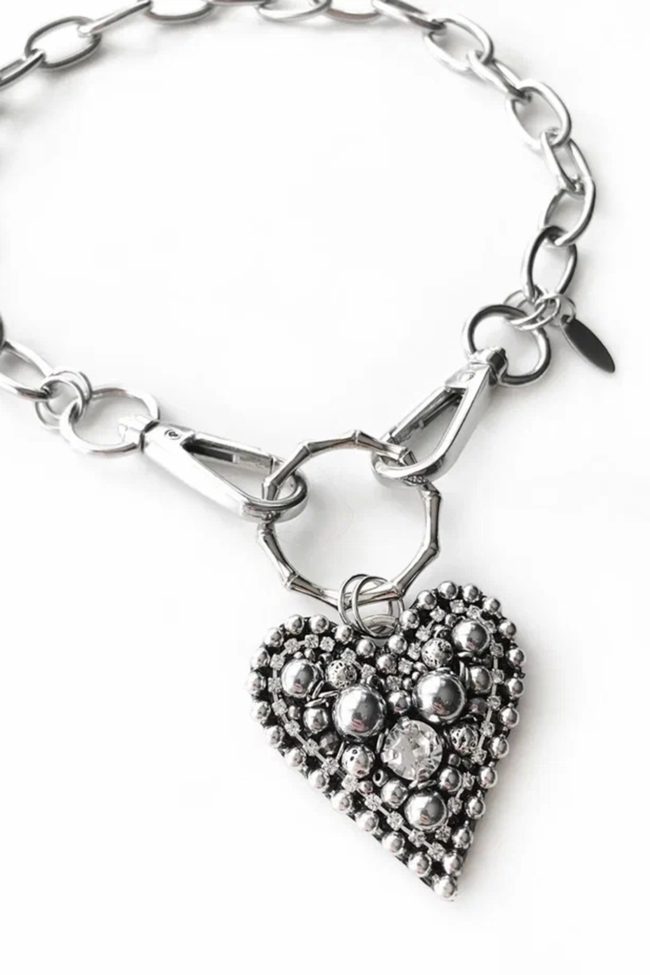 Украшение, которое сделает правильный акцент в спокойном образе. В центре внимания – подвеска в форме сердца, собранная ювелиром Окси вручную и вышитая камнями Swarovski, агатом, шунгитом и бусинами из стекла. Изделие фиксируется крупными карабинами.
