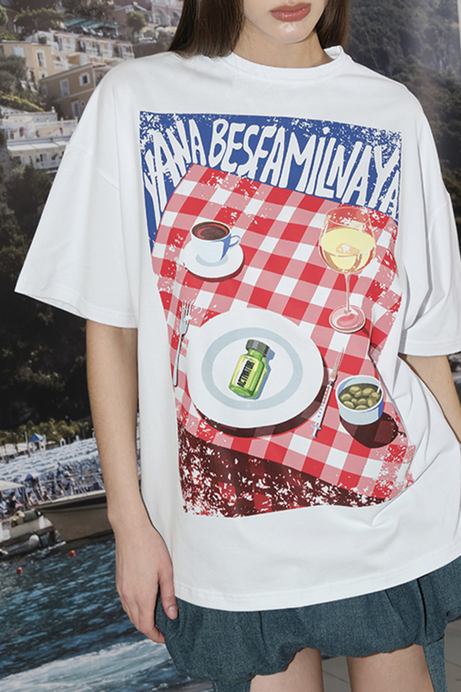 Принт на груди. О-образный вырез.