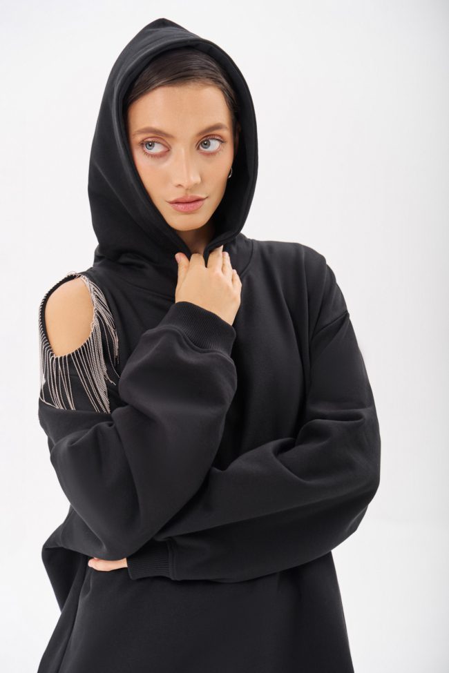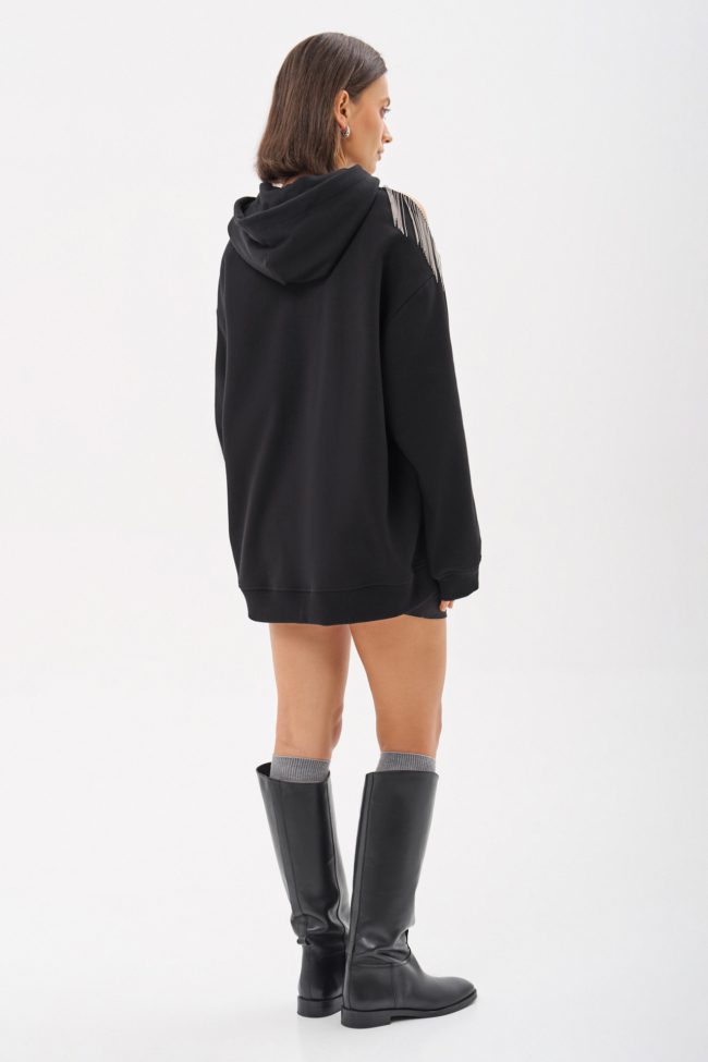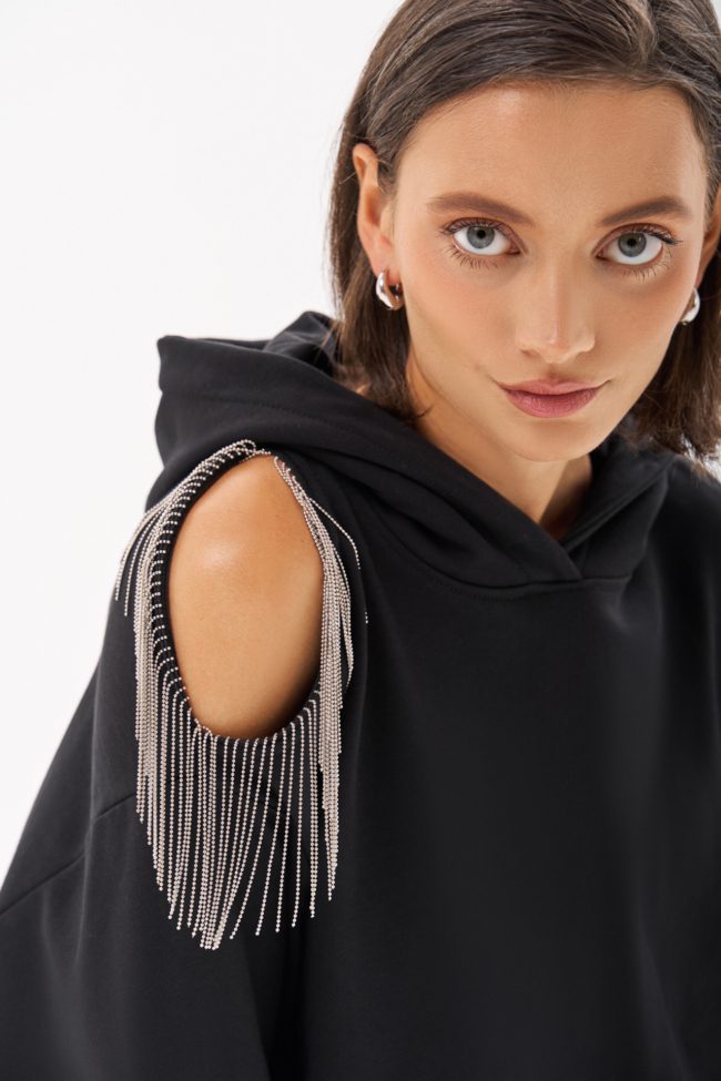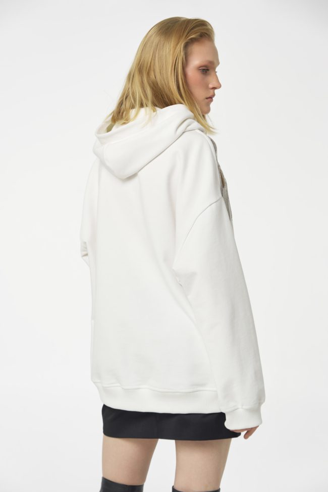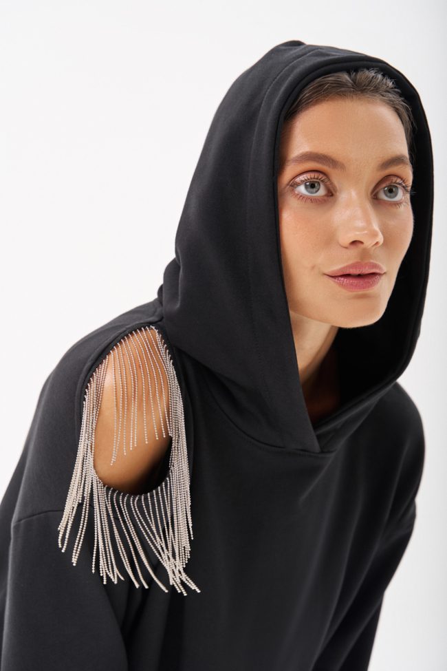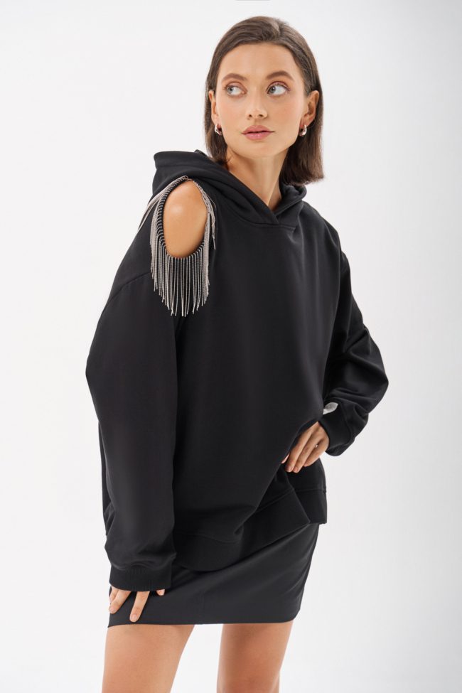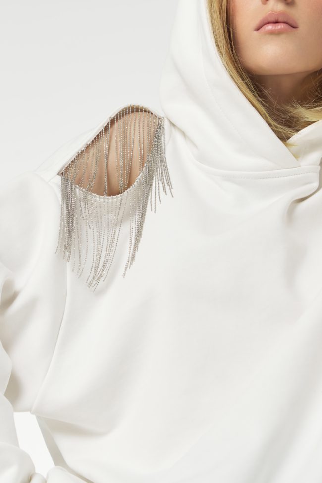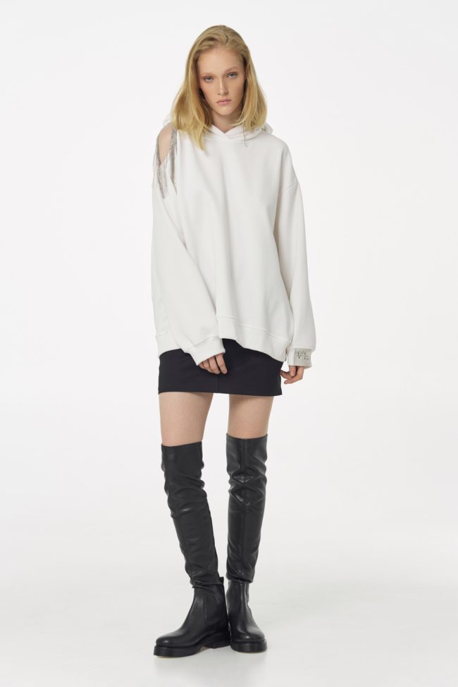 Худи силуэта oversize выполнено из хлопкового футера с фактурной изнанкой. Модель дополнена эффектным вырезом по линии плеча, края которого декорированы бахромой. Модель украсили текстильным патчем на рукаве с логотипом бренда.