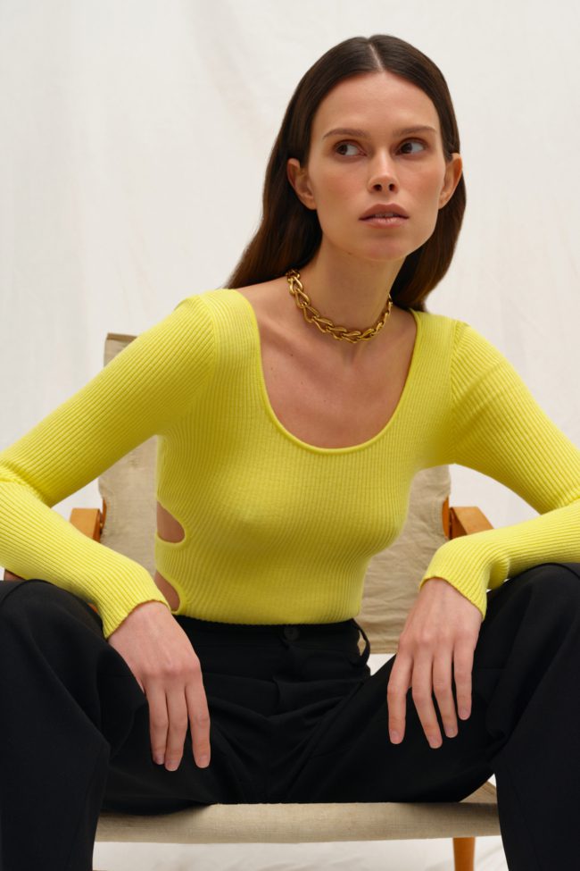 Трикотажное боди с эффектными вырезами в ярких цветах, а также в классическом черном. Круглый вырез декольте повторяет форму боковых вырезов и создает визуальную геометрию. Актуальная база для любого гардероба.