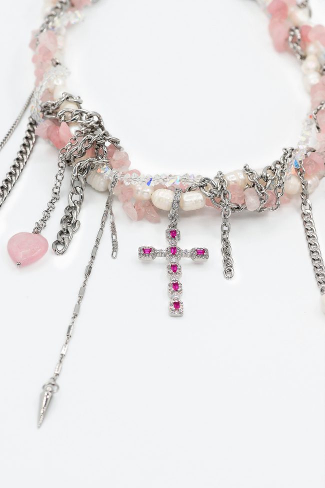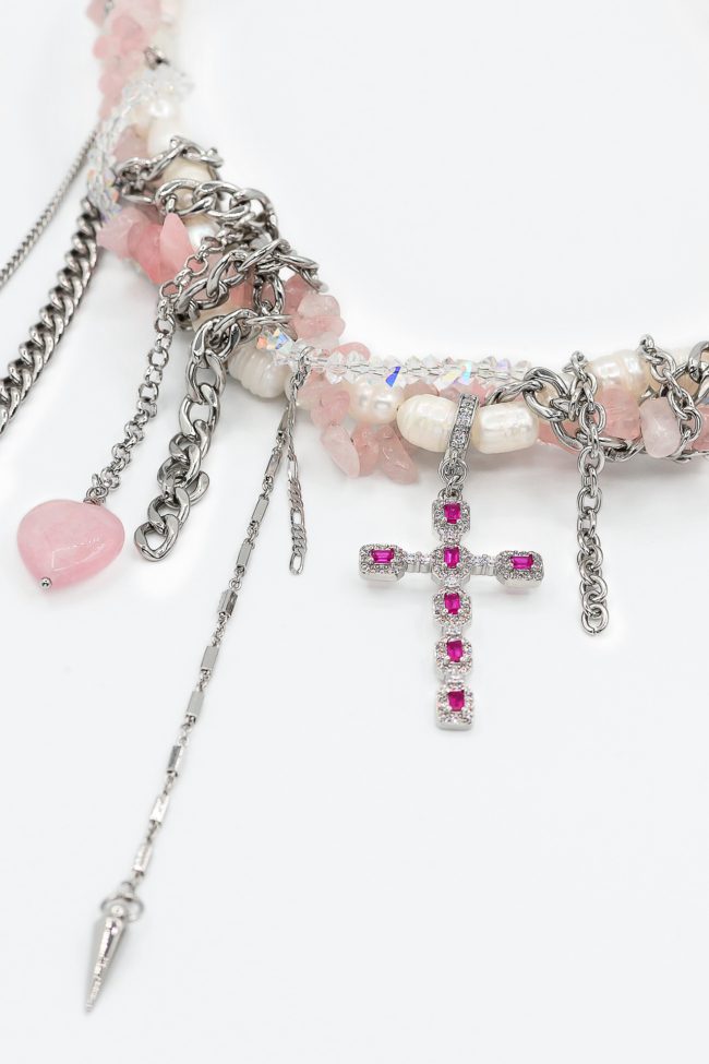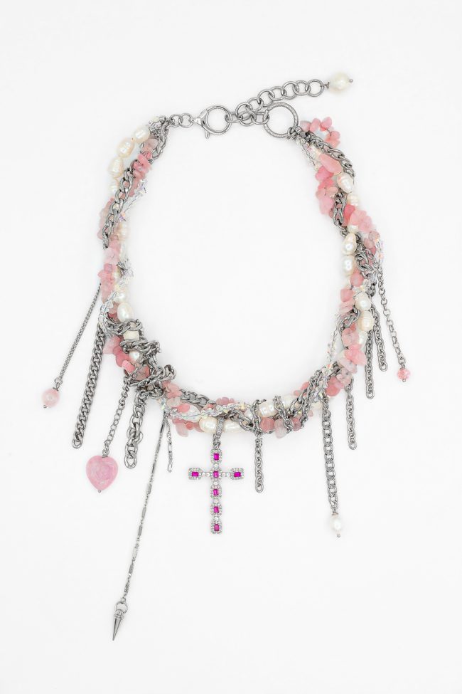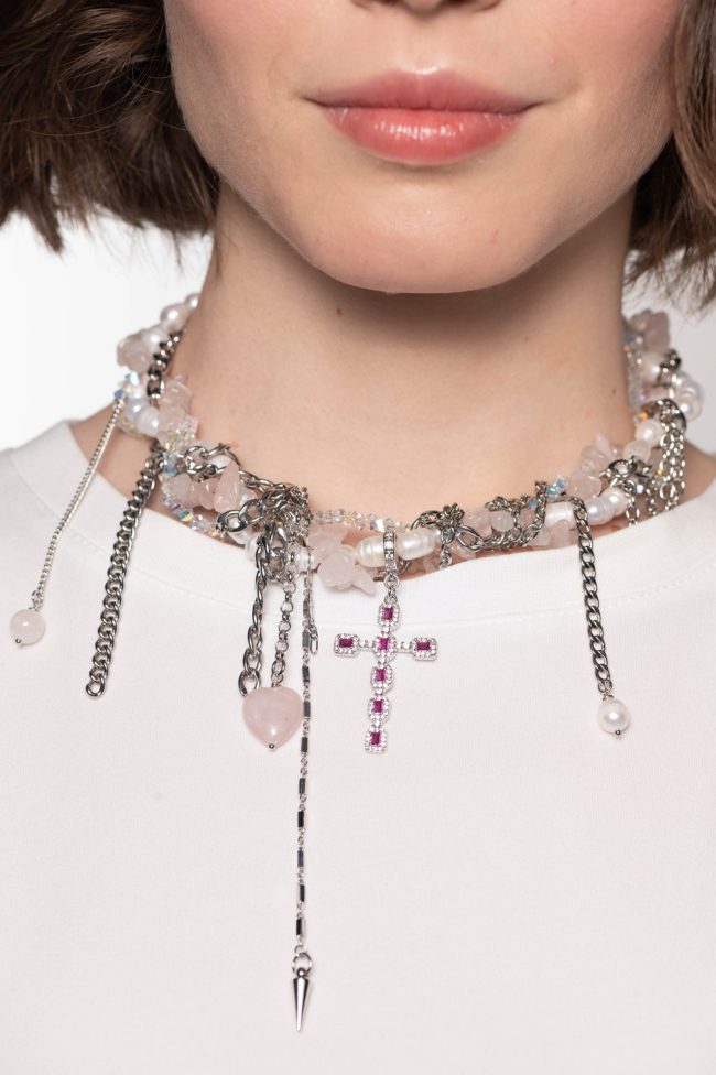 Колье BIJU BLESK из розового кварца и жемчуга, украшенного каскадами цепей и подвеской.