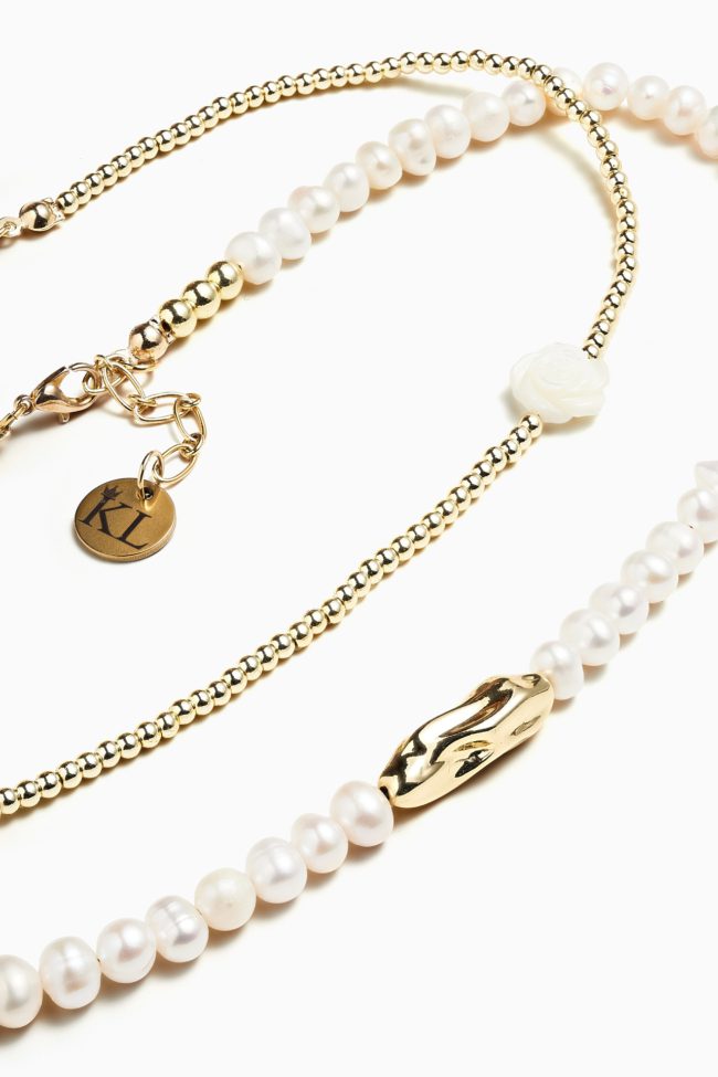 Комплект состоит из двух нитей, создающих неповторимый ансамбль. Одна нить выполнена их мелких бусин гематита со вставками из жемчужин и перламутровой розы. Вторая нить выполнена из жемчуга с акцентом на продолговатую бусину неправильной формы в центре. Фурнитура – латунь с позолотой.