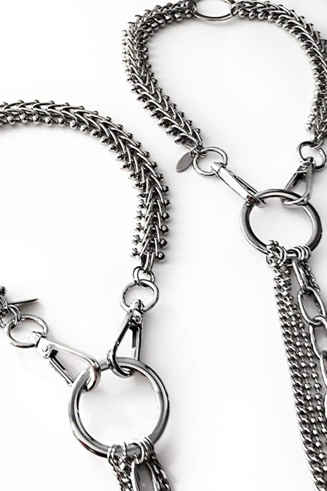 Колье-трансформер OXYLOVE в стиле гранж, которое состоит из цепей разных пленений и размеров. Подвеску можно снимать, оставляя основную цепь с фиксацией на карабины.