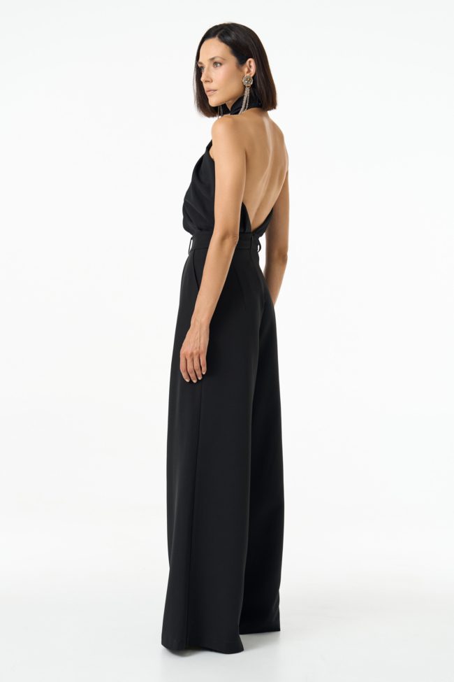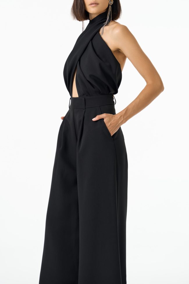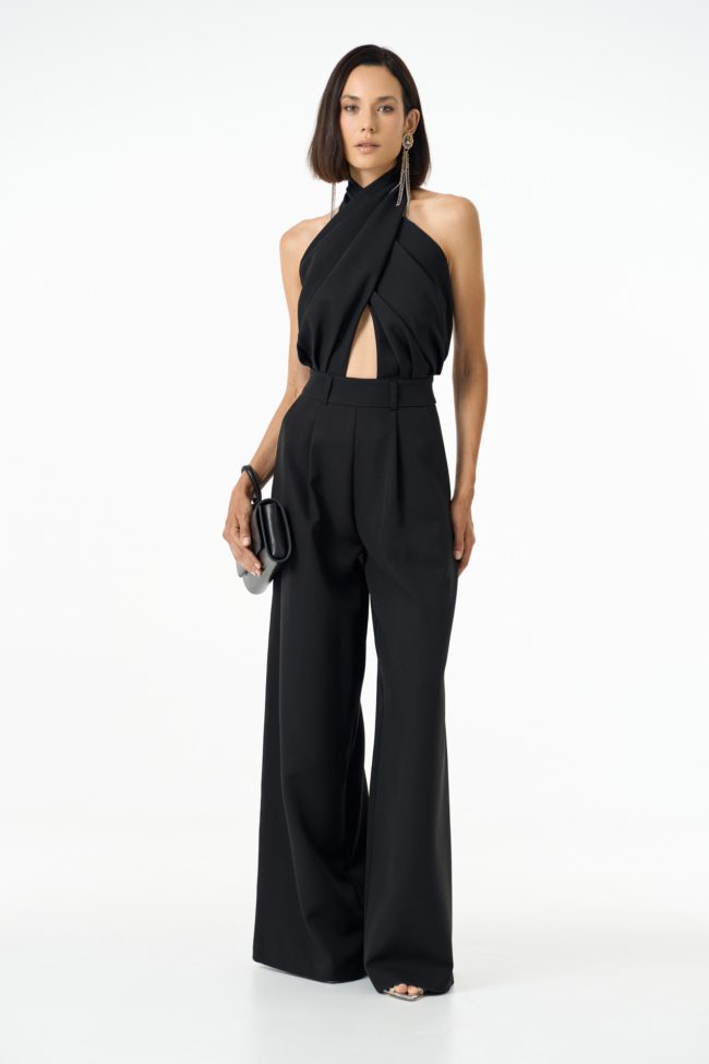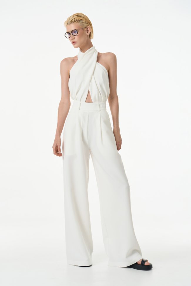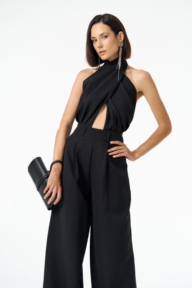 Современный, дерзкий и элегантный — этот комбинезон создаёт идеальный вечерний образ с минималистичным шиком. Верх выполнен в виде эффектного крест-овер лифа с открытыми плечами и вырезом на груди, подчёркивая зону декольте. Высокая посадка и широкие прямые брюки визуально удлиняют ноги и делают силуэт стройнее.