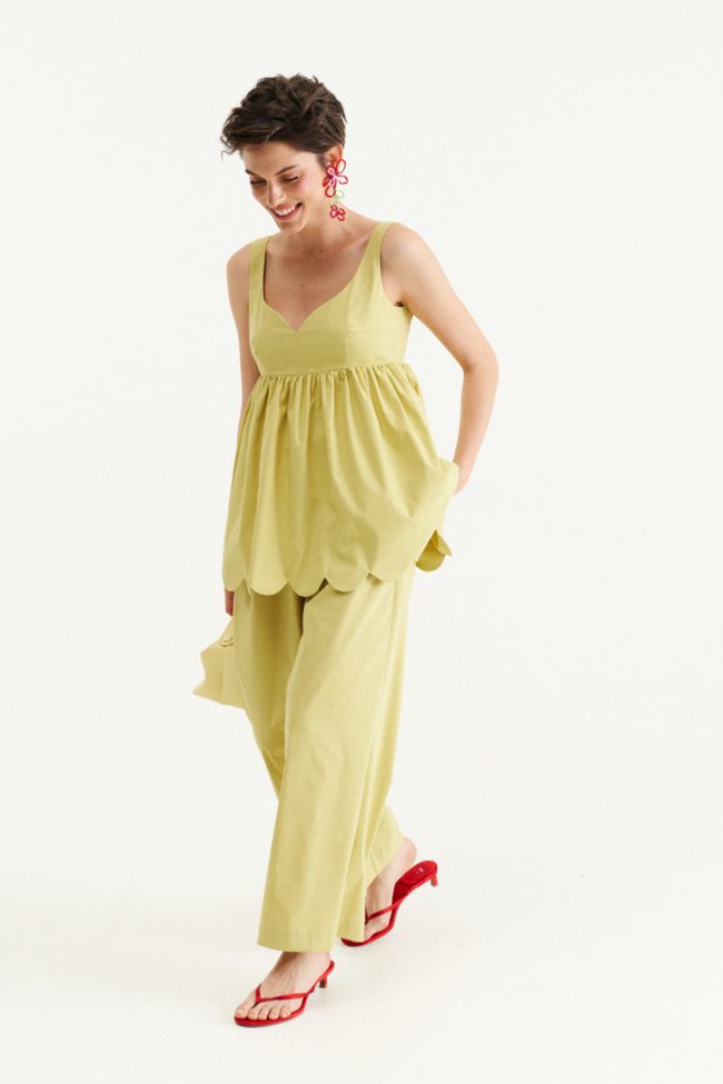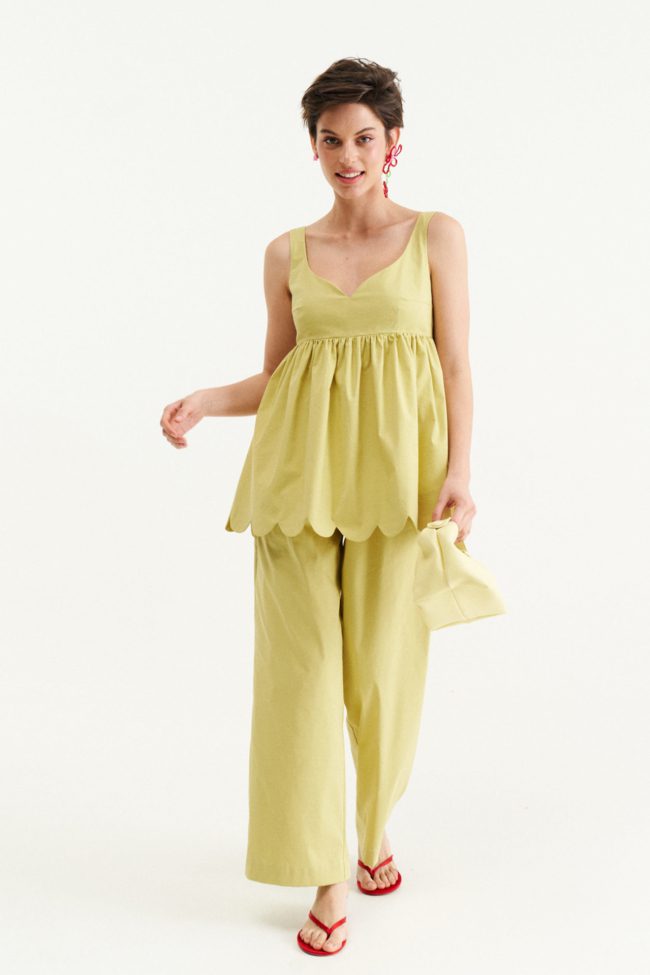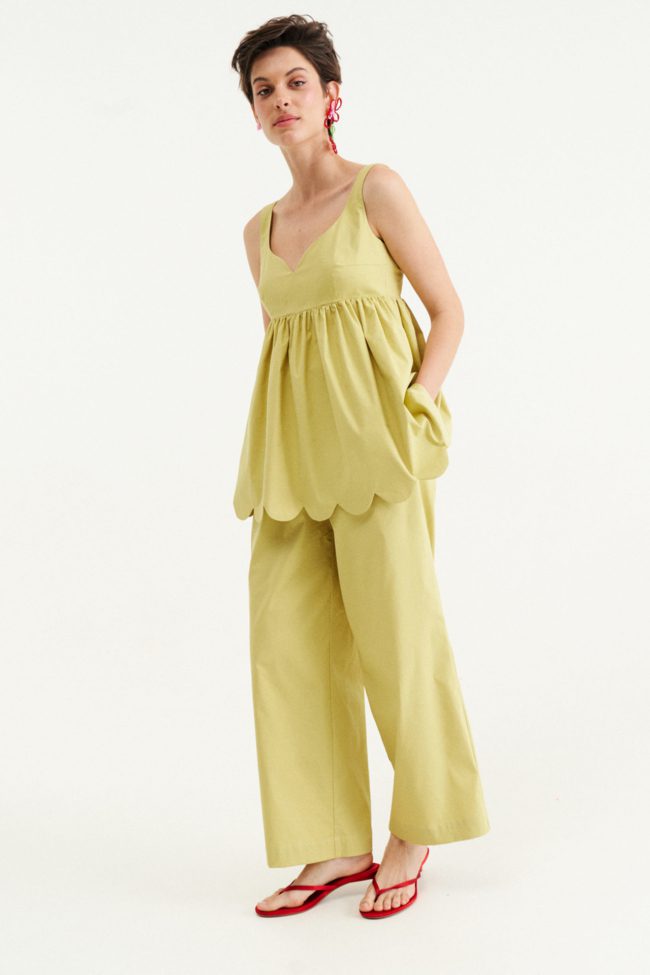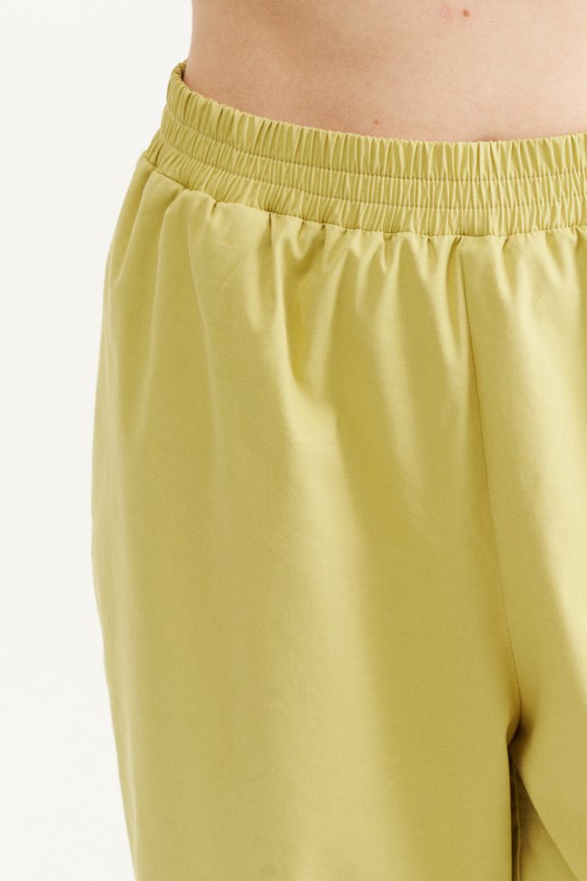 Брюки укороченной длины (до щиколотки), с карманами в боковых швах. Застежка на потайную молнию сбоку. Пояс на резинке.