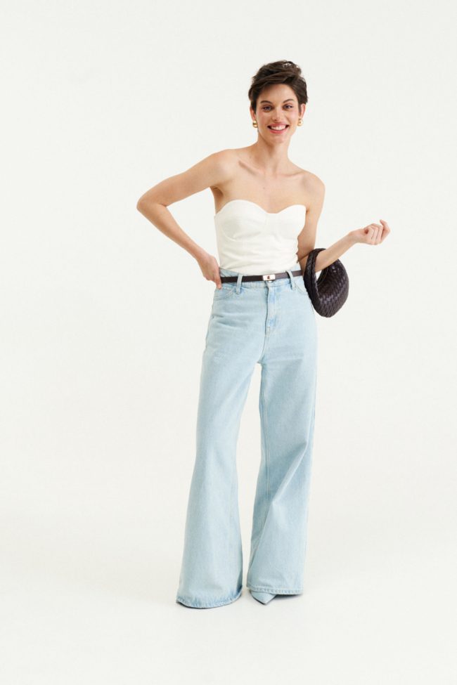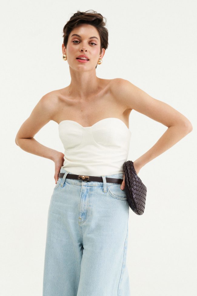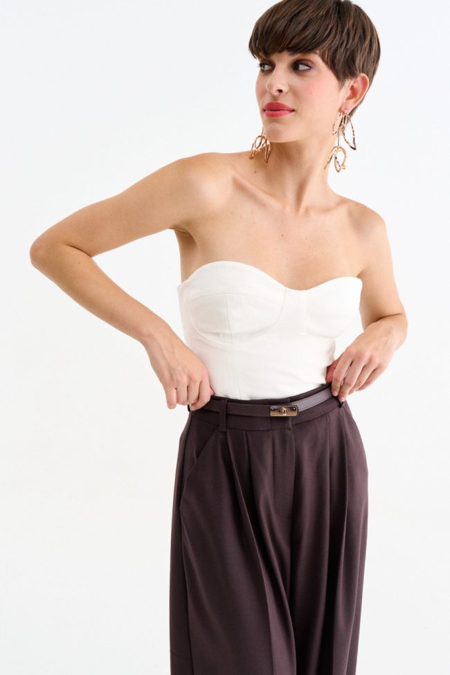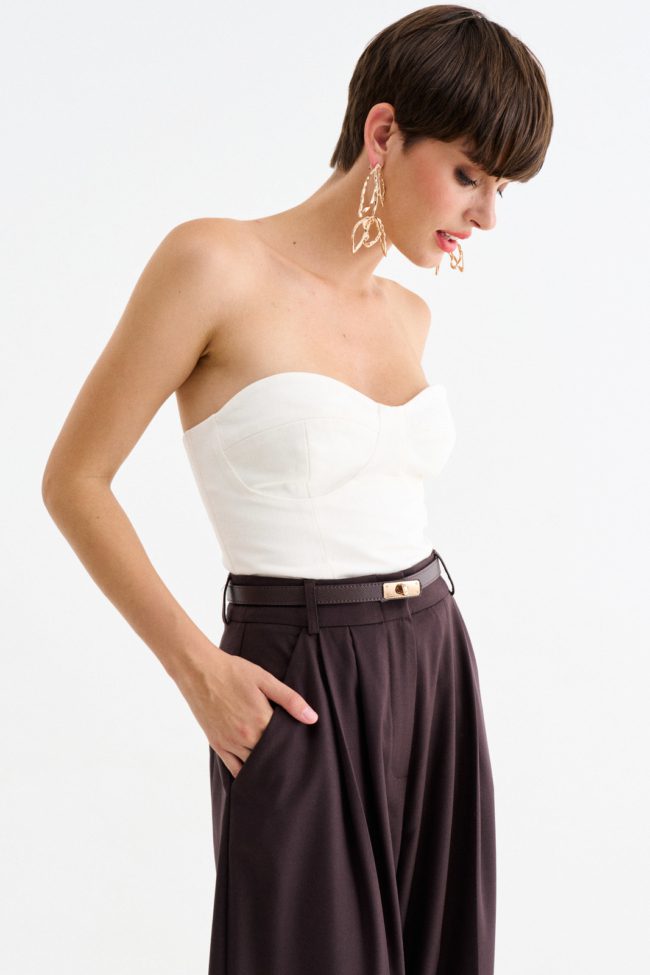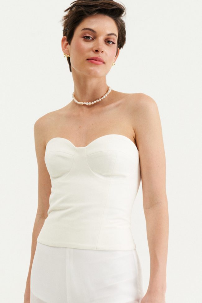 Топ-бюстье с изящными чашками и аккуратными рельефами подчеркивает фигуру. Молния на спинке добавляет современный акцент, а боковые вставки гарантируют комфорт и поддержку, делая топ идеальным выбором для создания стильного и выразительного образа.