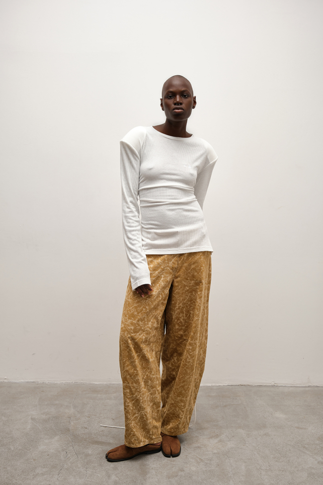 Силуэт у модели базовый, но с акцентом: плечики (не съёмные) создают выразительный верх, подчёркивая линию плеч. Декоративная шнуровка сзади и завязки позволяют регулировать посадку, добавляя индивидуальности и гибкости при составлении образов. Эти детали превращают простой лонгслив в ключевой элемент одежды — он может быть базой или центром внимания, в зависимости от сочетания.
