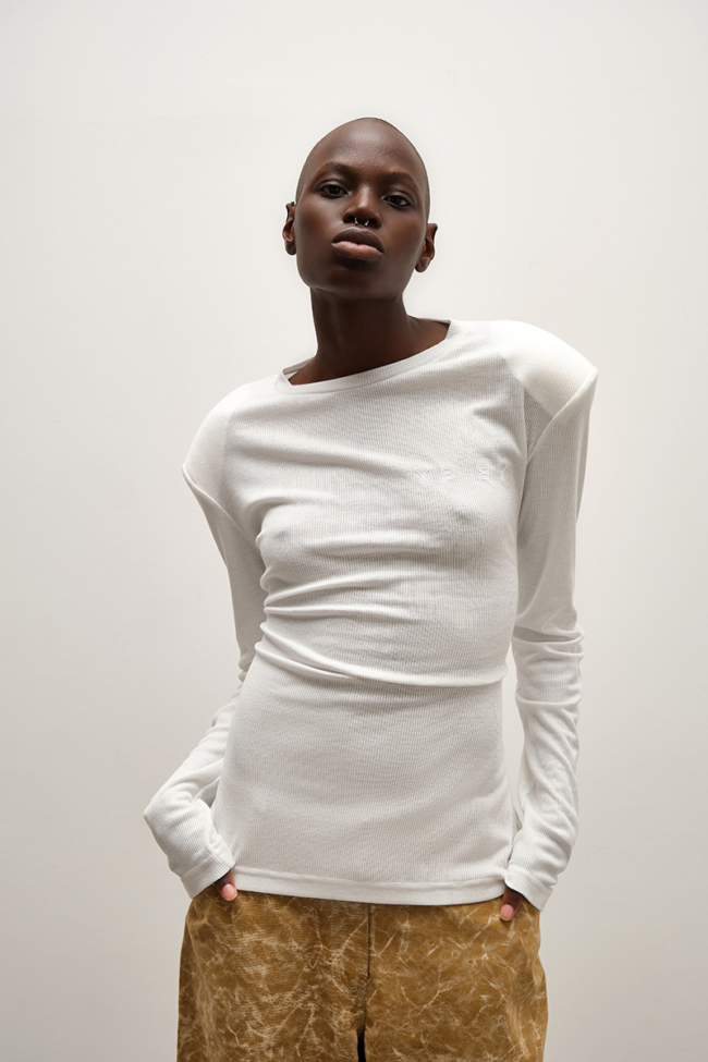 Белый лонгслив Nooodle — базовая вещь с выразительными деталями. Ткань «лапша» мягкая и эластичная, комфортна в носке. Плечики формируют акцентный силуэт, а декоративная шнуровка сзади и завязки позволяют регулировать посадку. Фирменная вышивка YB BY в тон ткани делает модель утончённой и лаконичной.