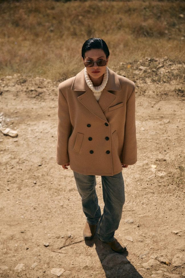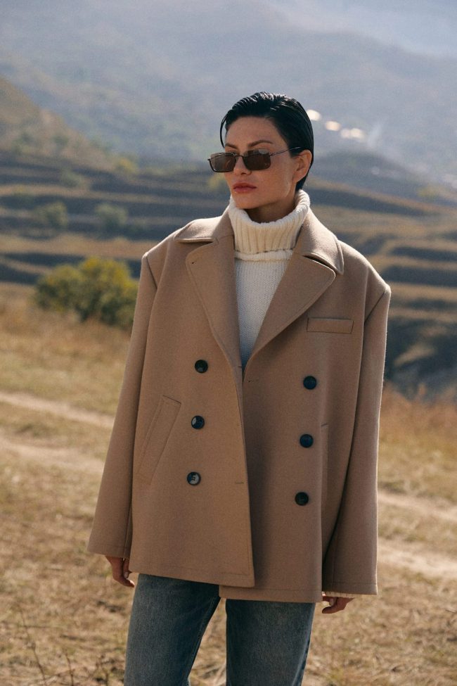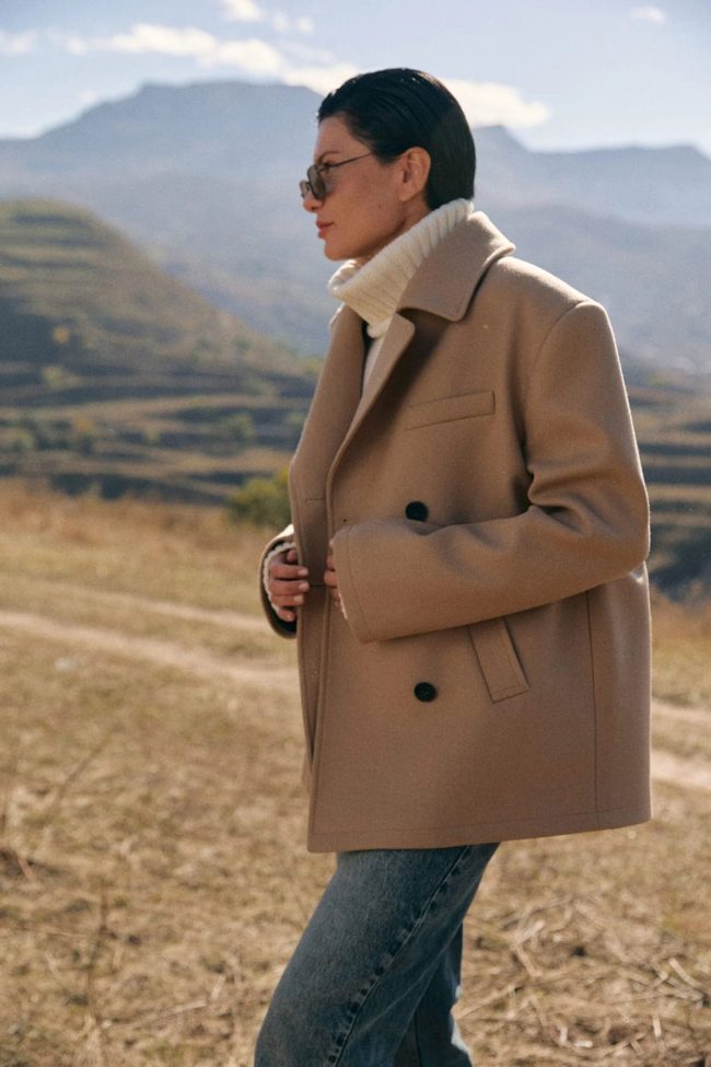 Двубортное полупальто силуэта oversize. Модель с отложным воротником и спущенной линией плеч дополнили двумя прорезными карманами. Свободный крой пальто формирует мягкий силуэт и хорошо сохраняет тепло тела внутри.