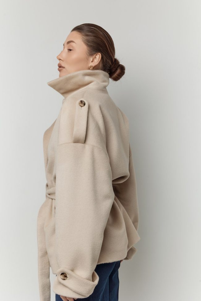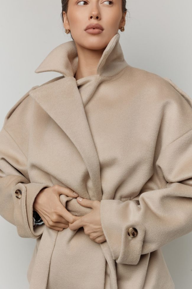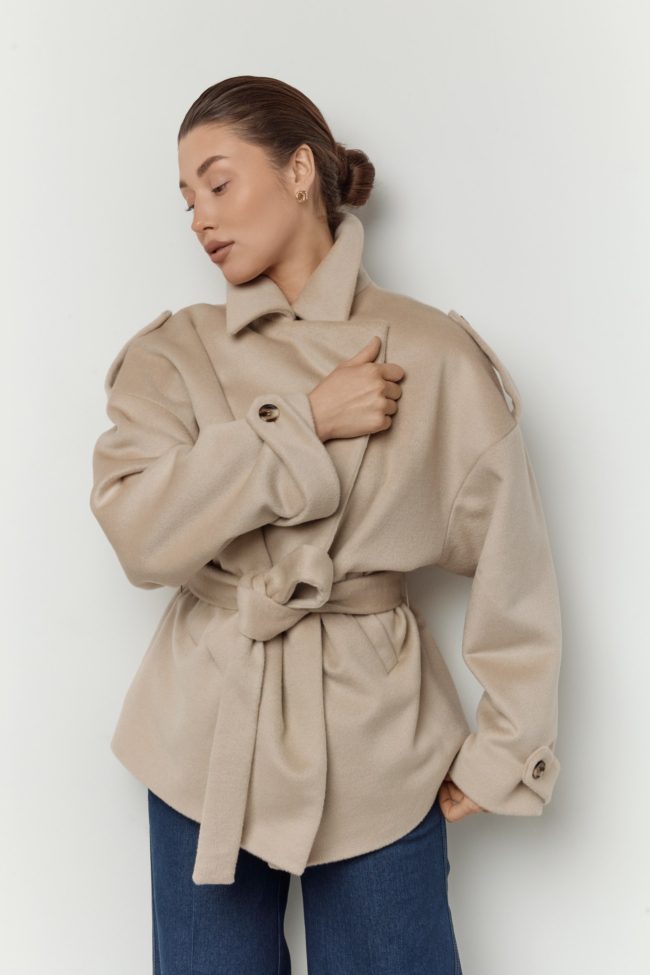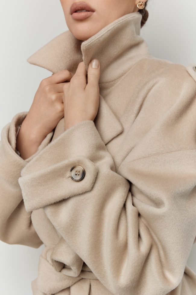 Свободный силуэт с поясом подчёркивает талию и позволяет варьировать посадку: носить пальто расслабленно, нараспашку, или собранным — с акцентом на фигуру. Модель органично сочетается как с повседневными образами (джинсы, трикотаж, базовые лонгсливы), так и с более собранными комплектами — платьями, костюмами, юбками миди.
