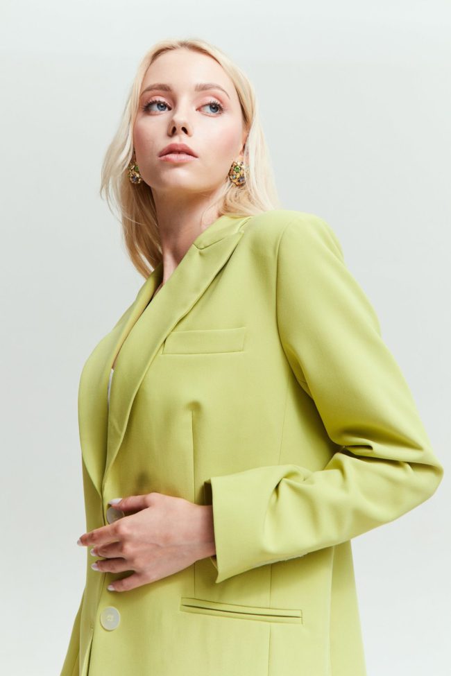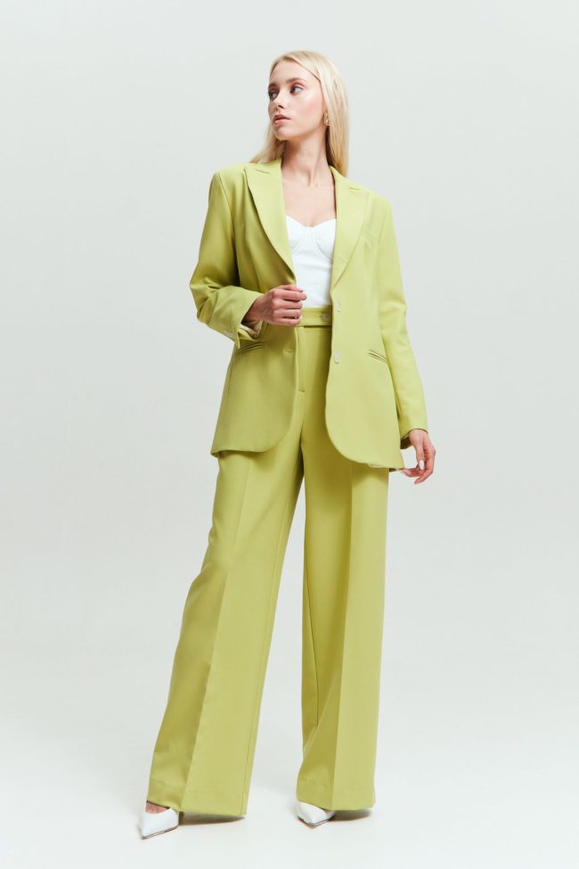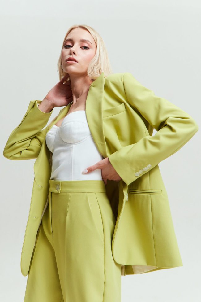 Дизайнеры VERESK label сделали ставку на цвет, выбрав для костюмной линии нежный розовый bubblegum и оттенок сочной мякоти лайма. Однобортный пиджак прямого силуэта с аккуратными планками карманов, заостренными лацканами и шлицей по спинке. Пиджак гармонично впишется в повседневные комплекты и разнообразит палитру офисного дресс-кода. Для создания полноценного образа рекомендуем сочетать с брюками в цвет и молочным жилетом из костюмной капсулы бренда VERESK label.