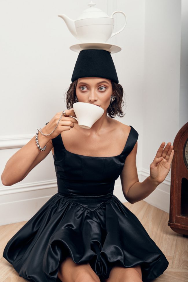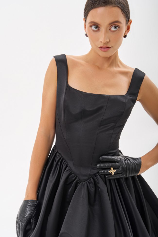 Эффектное платье, вдохновлённое образами сказочных принцесс. Лиф с чёткой геометрией, акцентированными вытачками и квадратным вырезом подчёркивает линию плеч и грудь, визуально вытягивает силуэт. Основной акцент — пышная юбка-буф, собранная по нижнему краю, создающая объём и мягкую архитектуру.