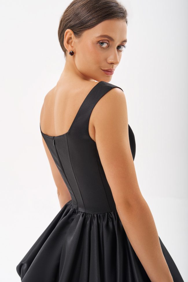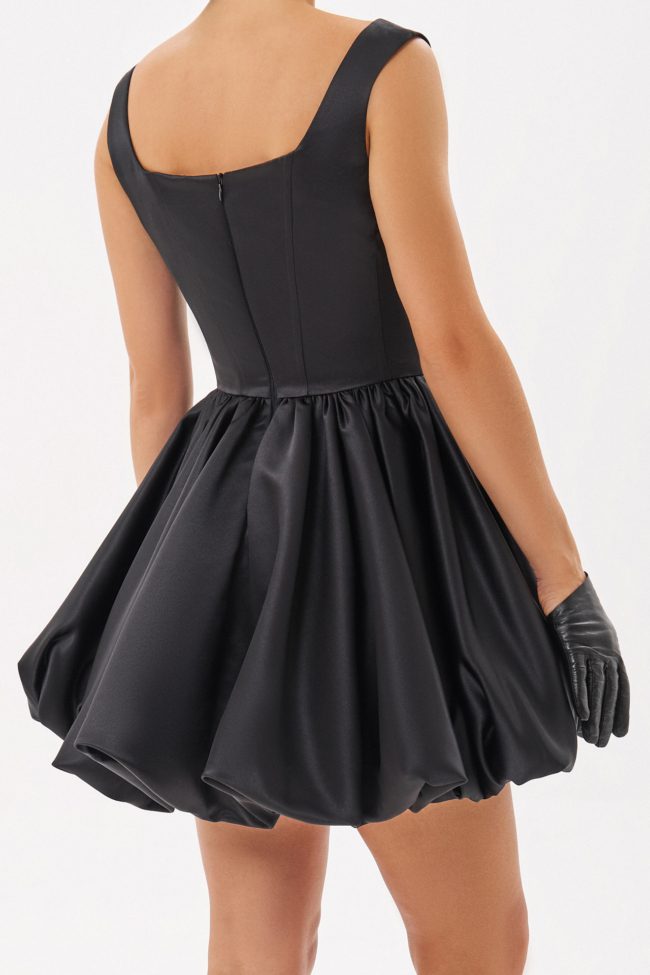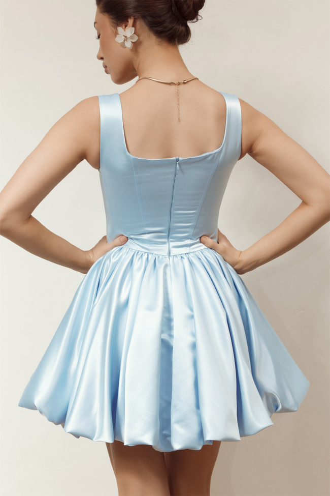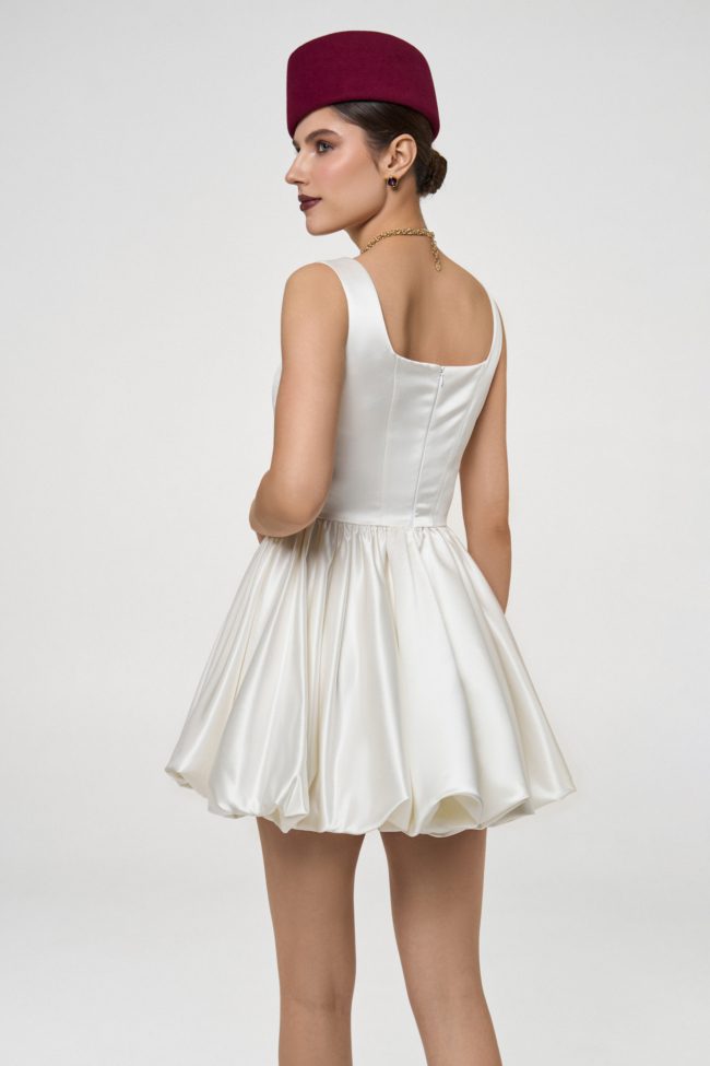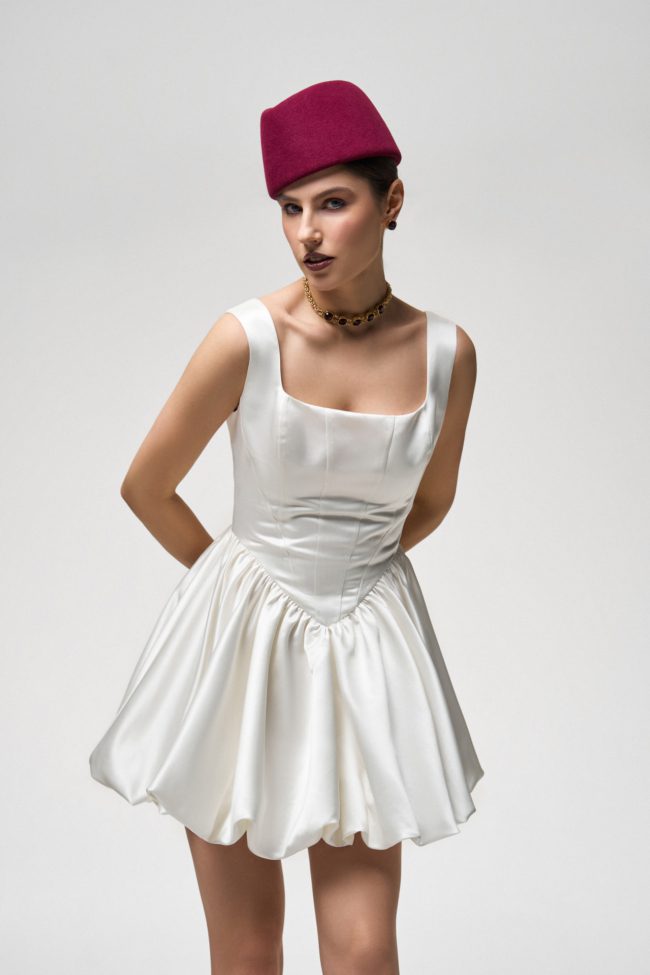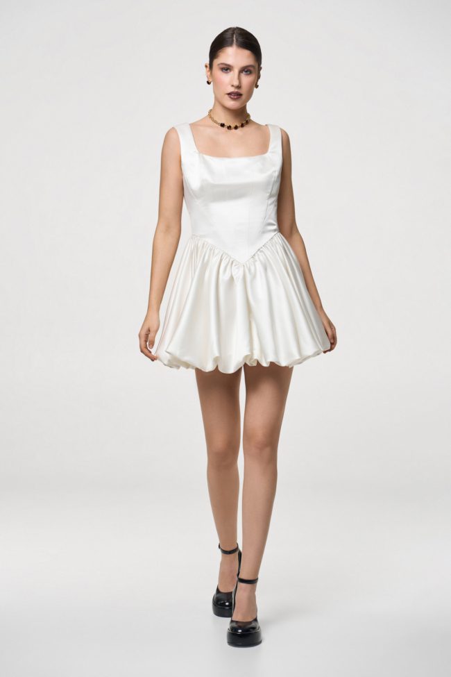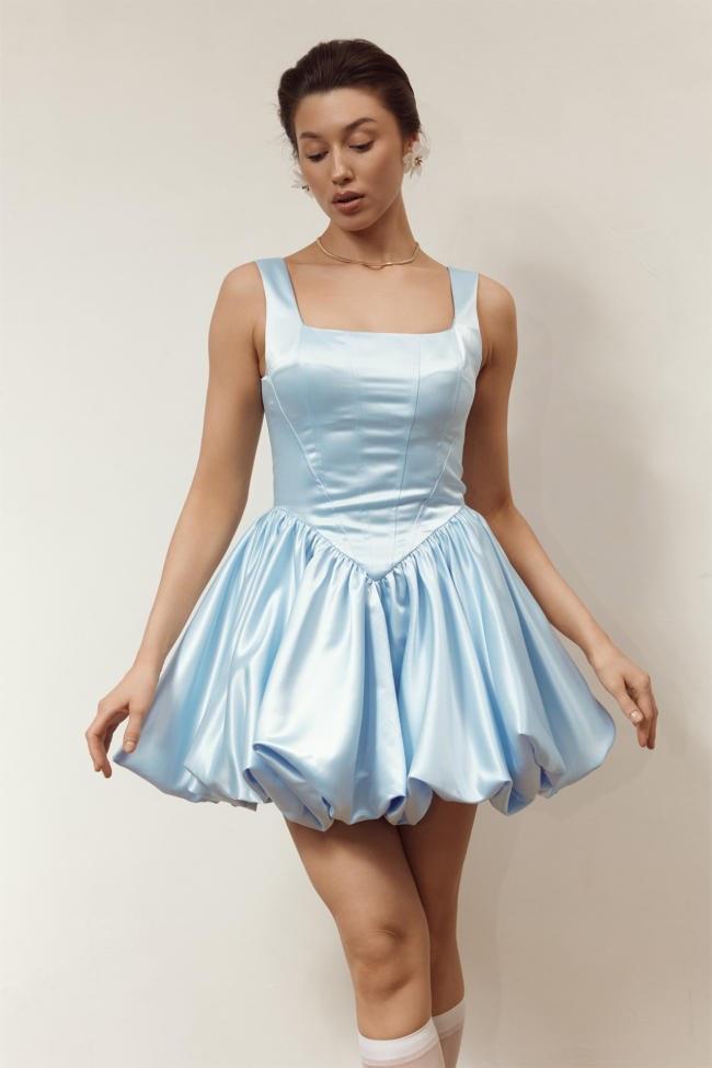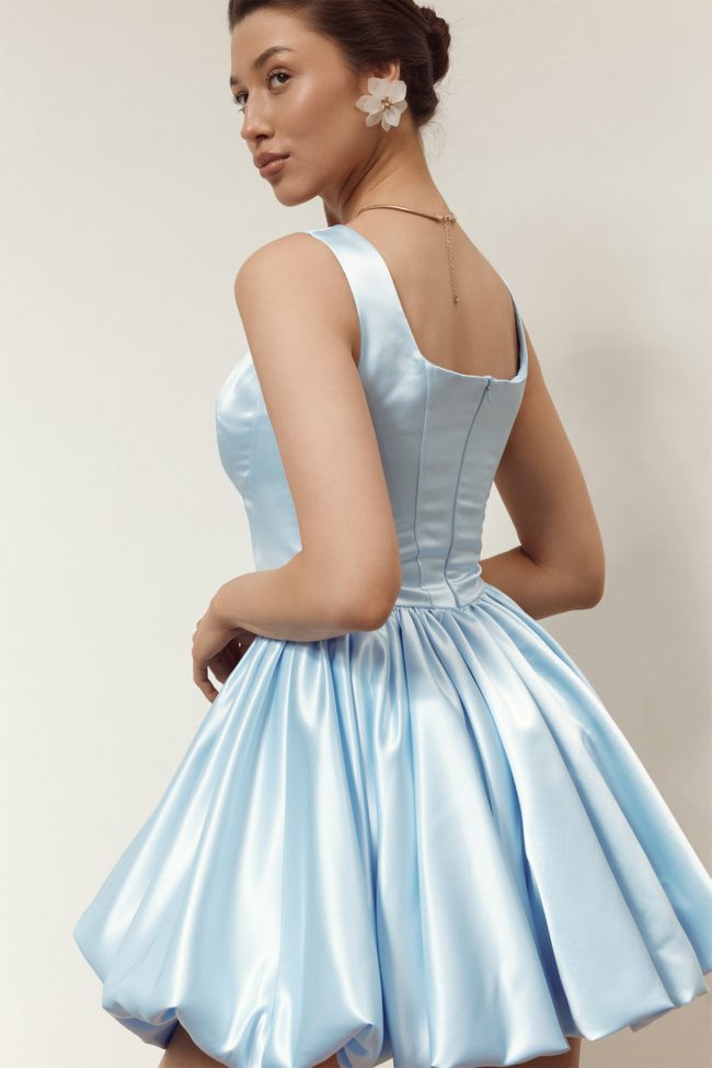 Модель в длине мини идеально подойдет для особенного случая, будь то коктейльная вечеринка, или вечерний выход. Силуэтный лиф из атласной ткани с деликатным блеском, а юбка баллон – переигрываем классику в смелый образ.