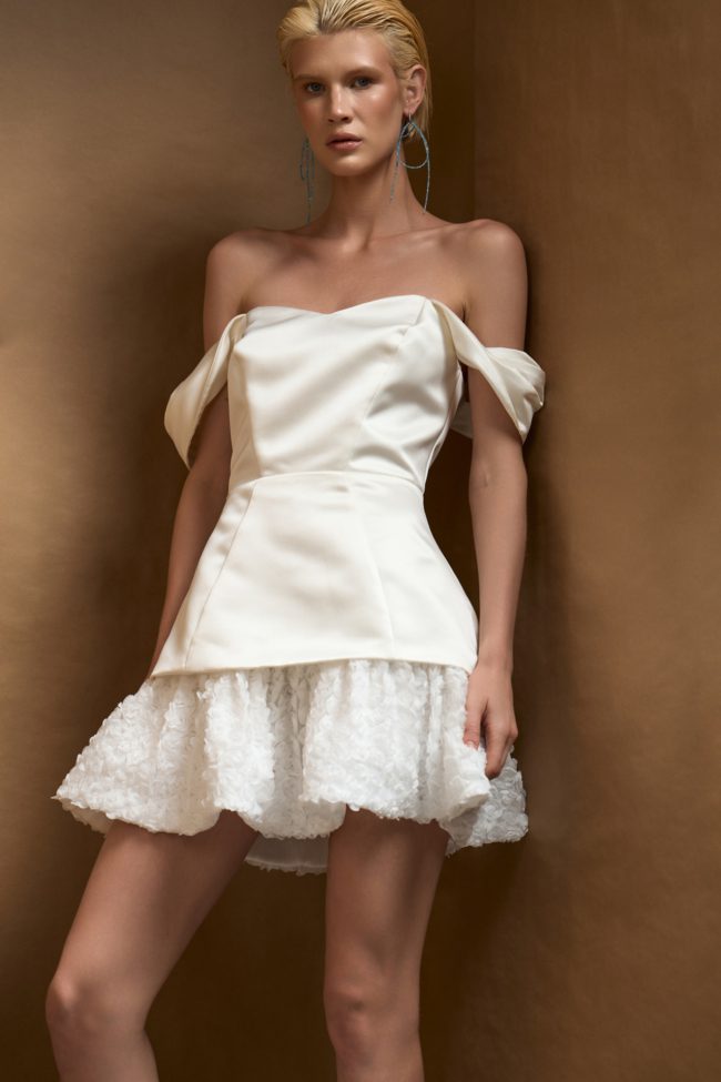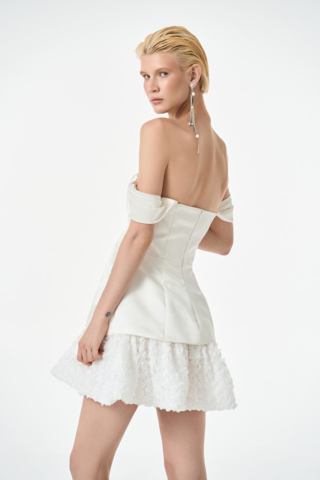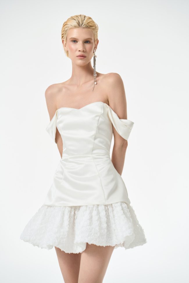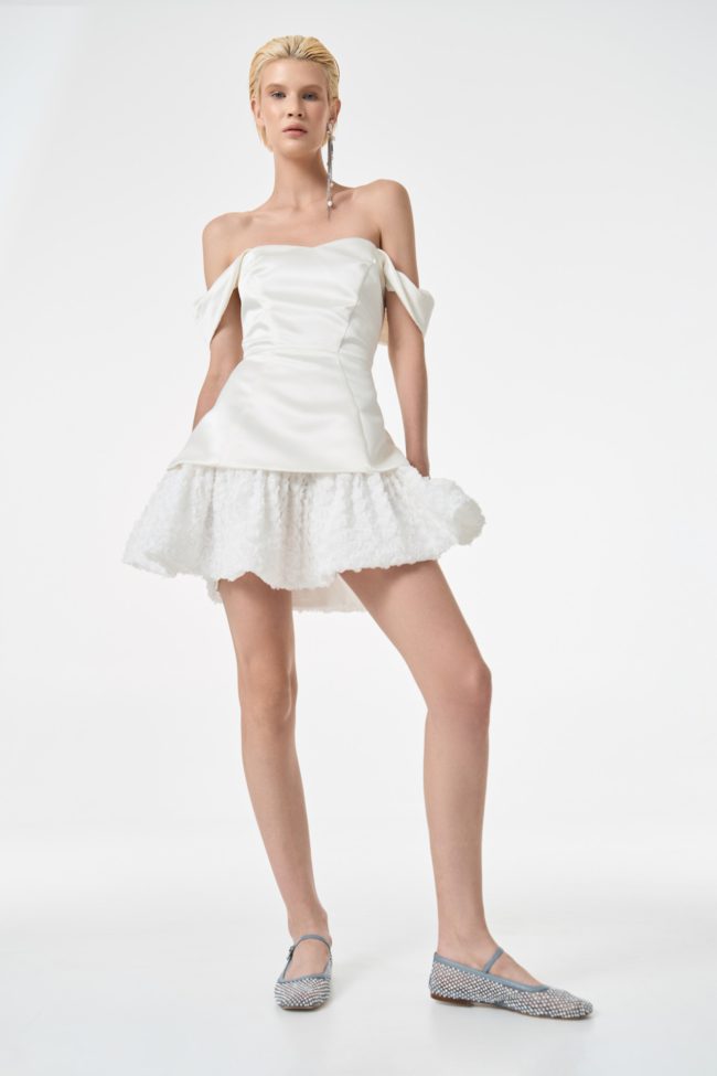 Жемчужно-белое платье-бюстье в длине мини идеально подойдет для особенного случая, будь то коктейльная вечеринка или вечерний выход. Корсетный силуэтный лиф с косточками выполнен из атласной ткани с деликатным блеском и дополнен баской, а расклешенный подол – из воздушной ткани, будто сотканной из миллиона белых роз.