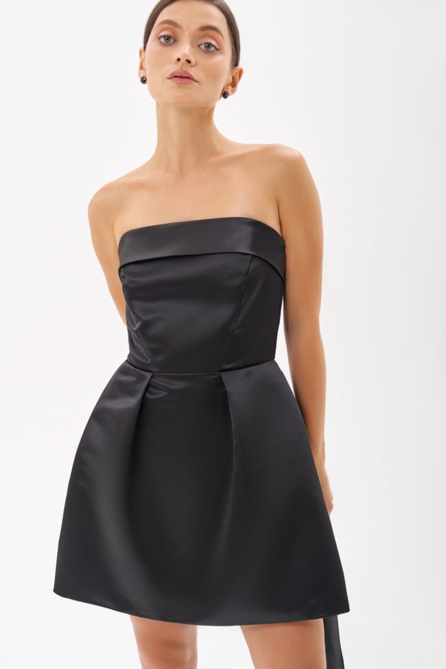 Мини платье-бюстье с корсетным лифом на косточках и расклешенным подолом может стать идеальной основой вечерних образов. Модель из атласной шелковистой ткани с деликатным блеском застегивается сзади потайной молнией.