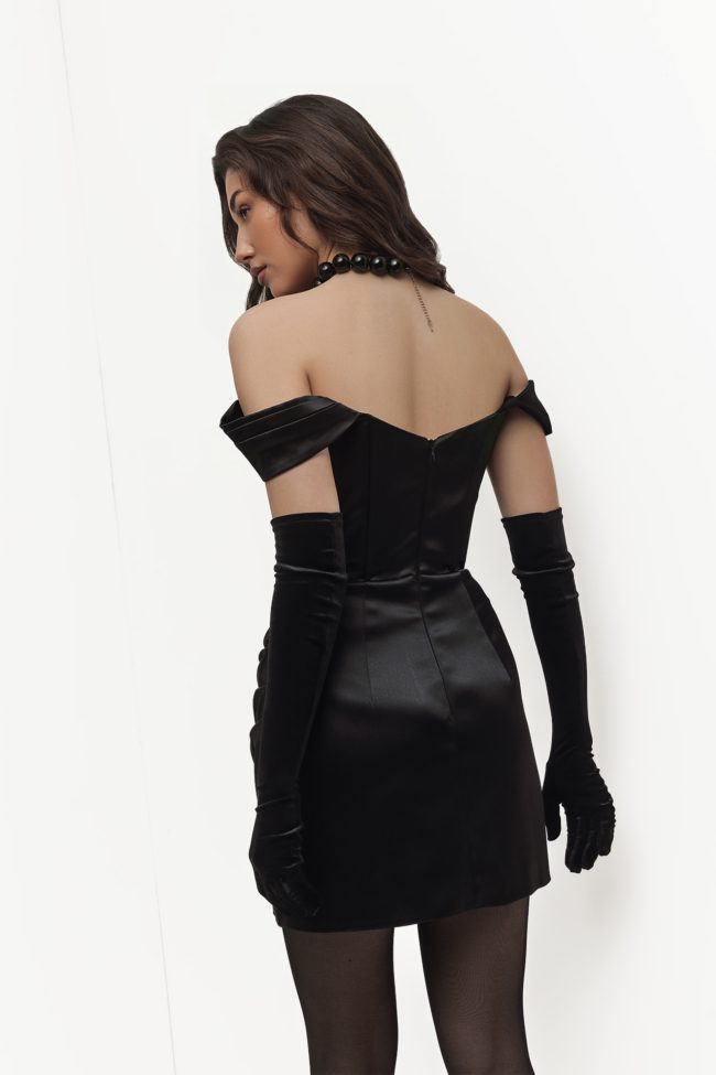 Верх платья оформлен открытой линией плеч с аккуратным корсетным кроем, который подчёркивает зону декольте и ключицы, сохраняя при этом благородную сдержанность. Чёткие вертикали корсета визуально вытягивают силуэт и формируют аккуратную посадку. Юбка с мягкой драпировкой добавляет образу пластичность и движение, создавая эффект “живой” ткани и делая платье особенно выразительным в динамике.