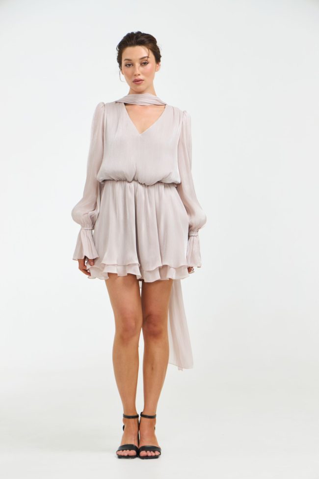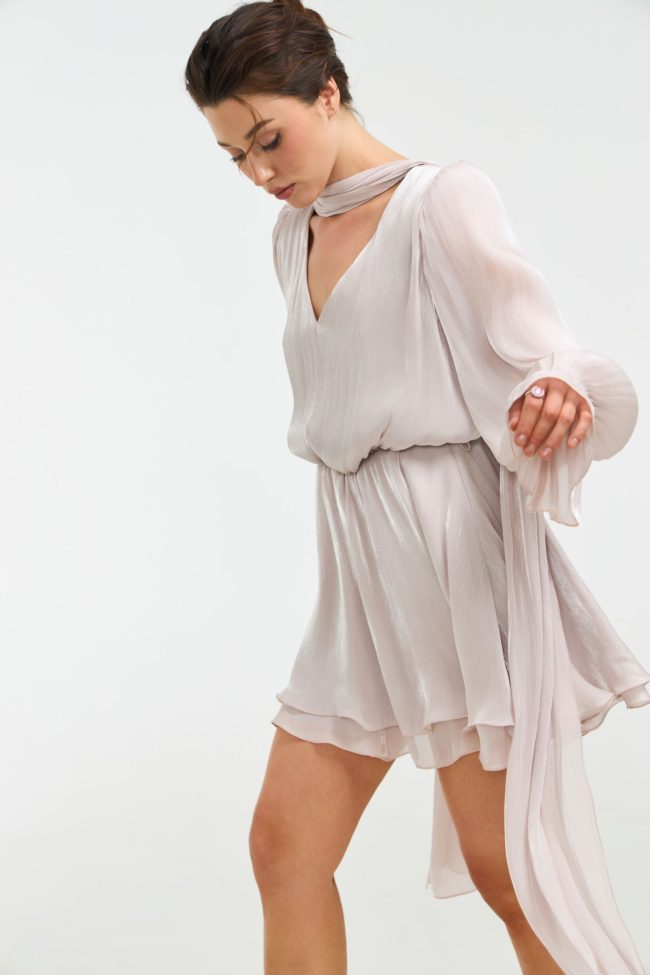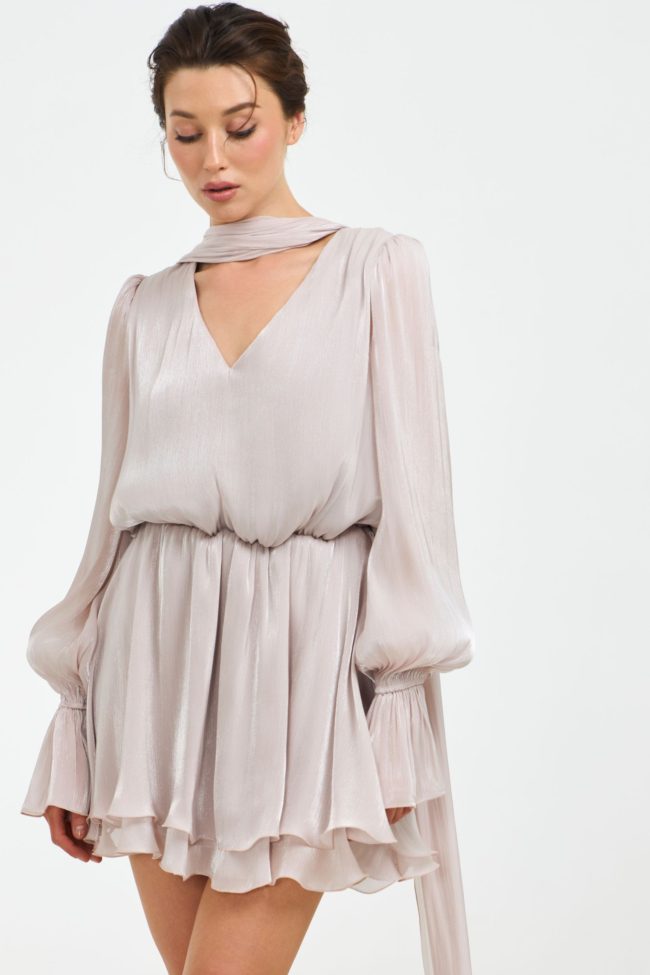 Тонкий блеск материала делает бежевый оттенок особенно выразительным — он меняется при разном освещении, переходя от ледяного до жемчужно-небесного. Это платье идеально подойдёт для торжественных мероприятий, коктейлей, фотосессий или вечерних ужинов у моря.