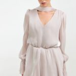 Платье AB Anastasiya Burdyugova бежевое с поясом и объёмными рукавами выполнено из лёгкой переливающейся ткани.