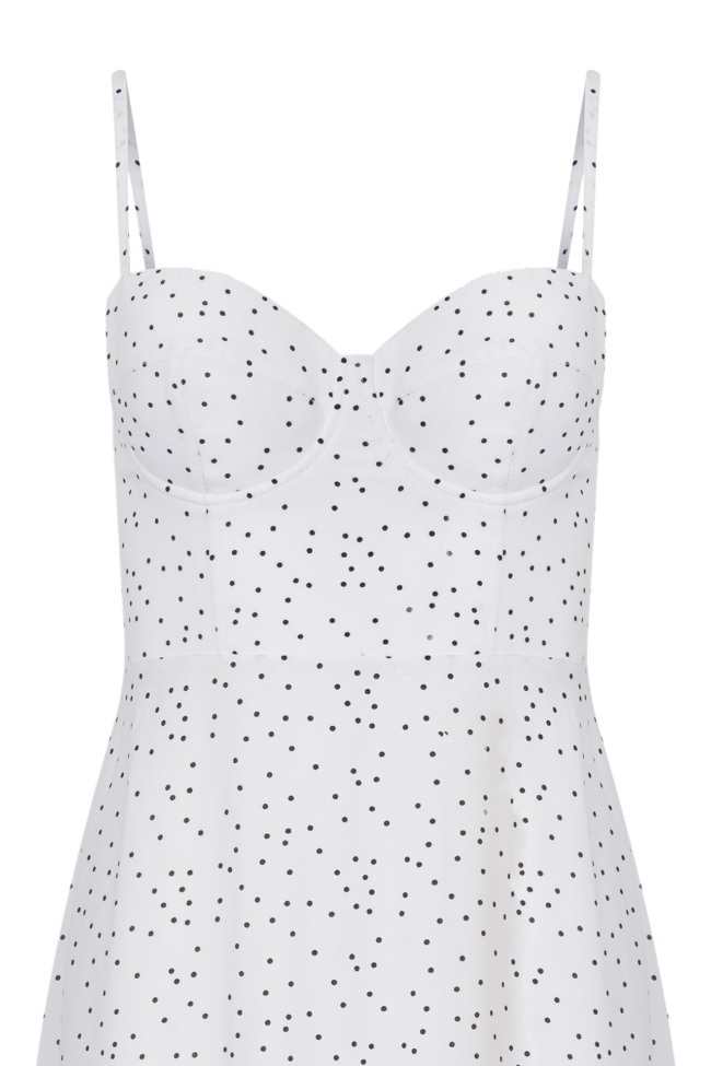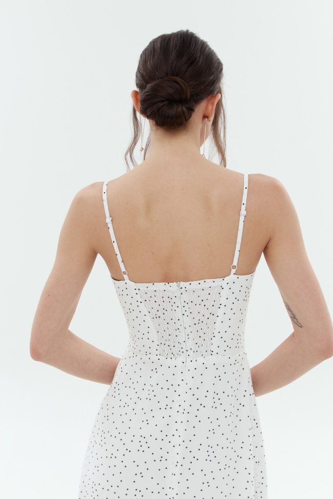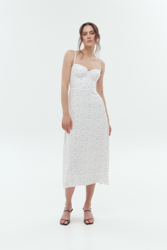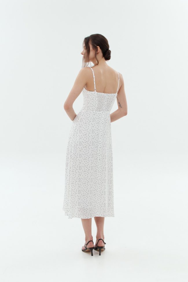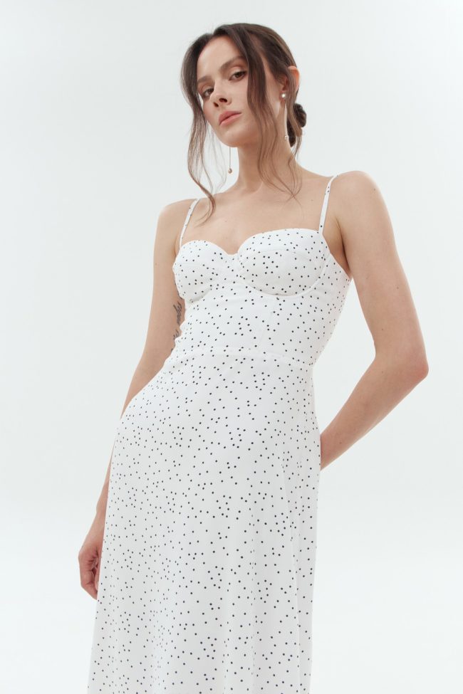 В создании женственного силуэта платьям с приталенным силуэтом нет равных. Корсетный лиф дополнен рельефными мягкими косточками, которые красиво моделируют силуэт. Для пошива дизайнеры V|L выбрали европейскую шелковистую вискозу c принтом в мелкий горох. Изысканная классика
