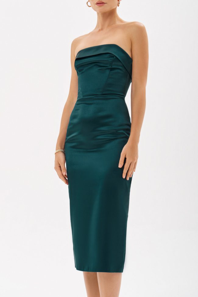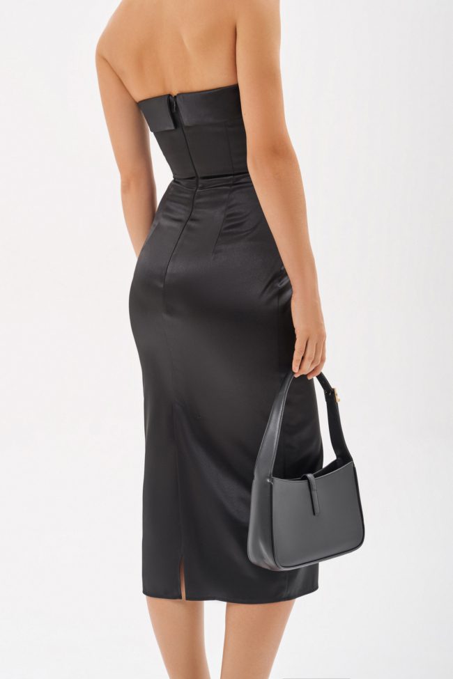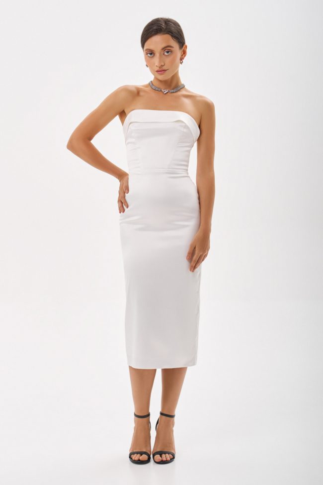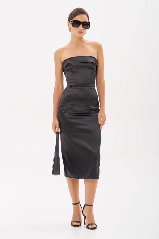 Платье-футляр из новой коллекции бренда. Лиф-бюстье на косточках эффектно подчеркнет зону декольте, а юбка-карандаш в длине миди прекрасно сядет на любую фигуру.