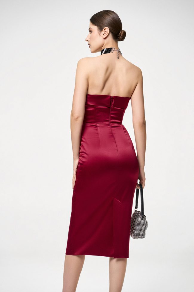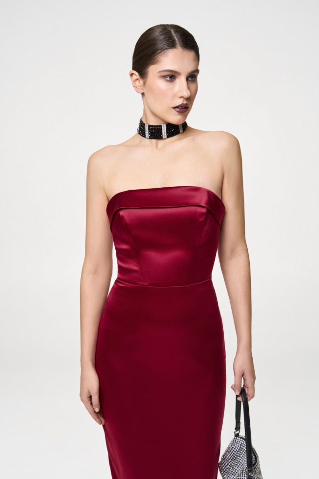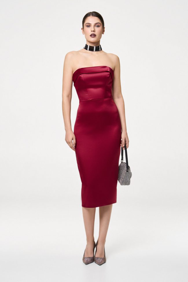 Платье-футляр из timeless коллекции бренда. Лиф-бюстье на косточках эффектно подчеркивает зону декольте, а юбка-карандаш в длине миди со шлицей – линию бедер.