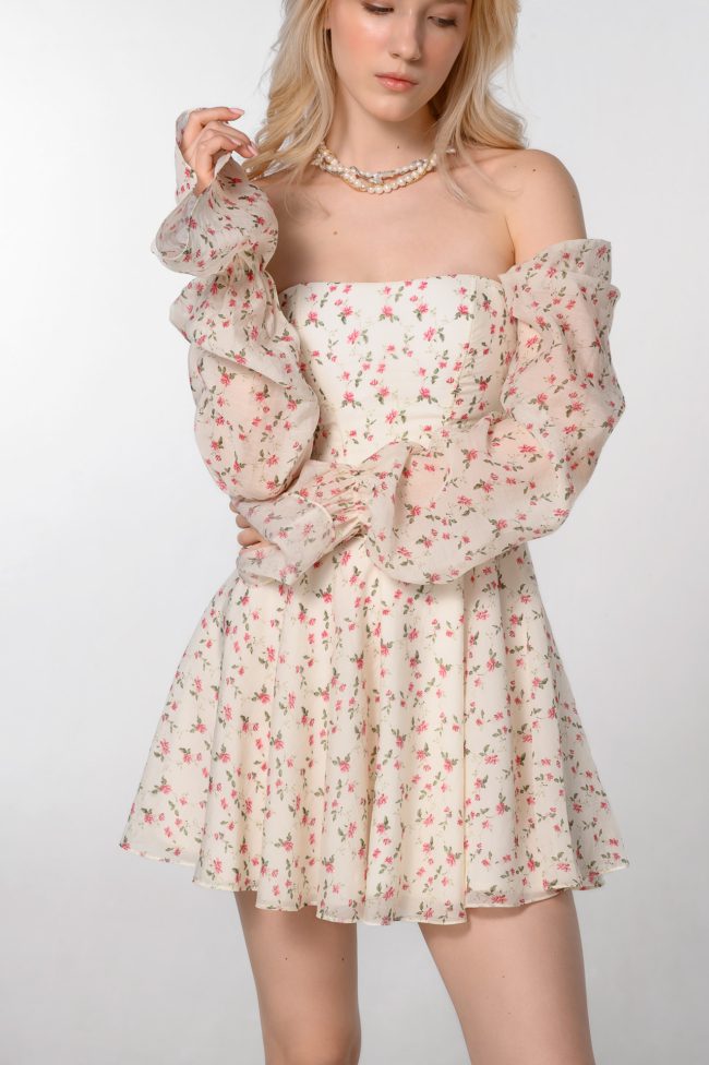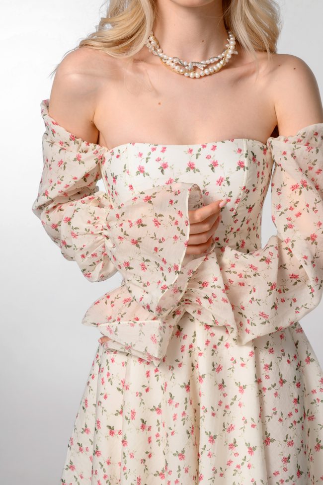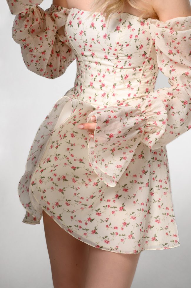 За первое отвечают корсетный скульптурный верх и длина мини. На второе работает как цветочный принт, так и силуэт.