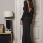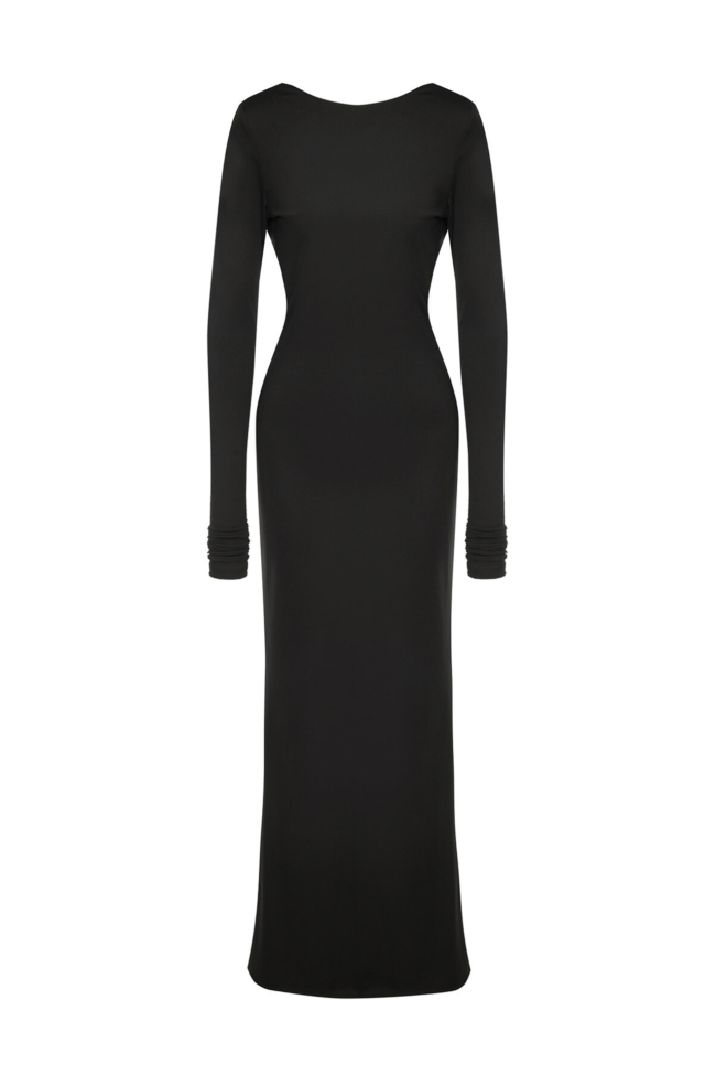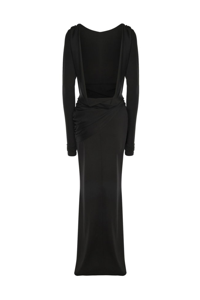 Фасон шоу-эффектен: макси-длина и открытая спина. Всё это делает модель заметной. Драпировка на бедрах подчёркивает линию тела, создавая женственный силуэт, а высокий разрез добавляет драмы и длины ногам.