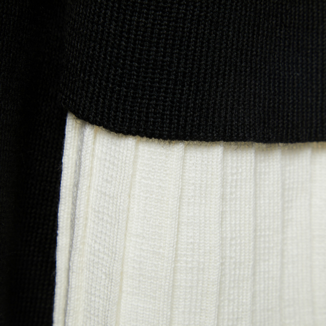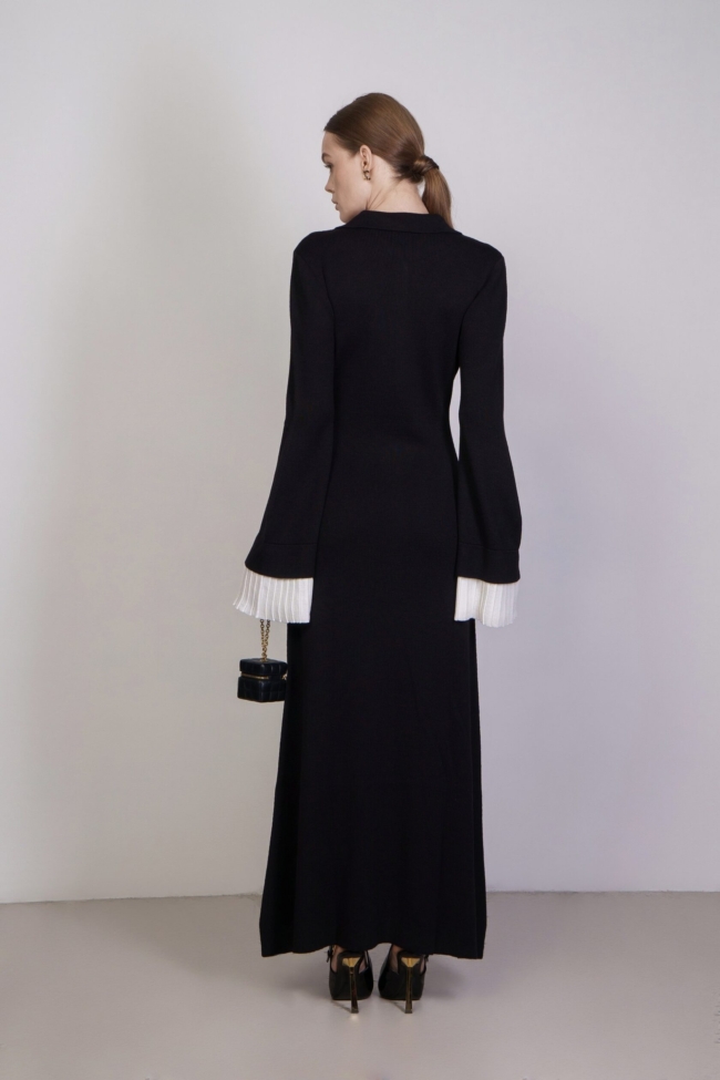 В основе смеси: 50% меринос и 50% акрил — материал, мягкий к коже, обладающий лёгкостью, теплом и хорошей износостойкостью. Такой состав позволяет платью сохранять форму и структуру даже после длительной носки. Чёрный цвет — глубокий, классический оттенок, который устойчив к визуальной нагрузке и сочетается с яркими элементами или базовыми тенями гардероба.