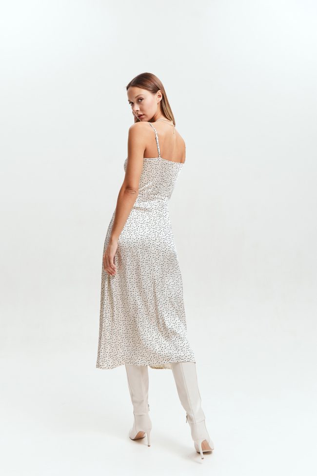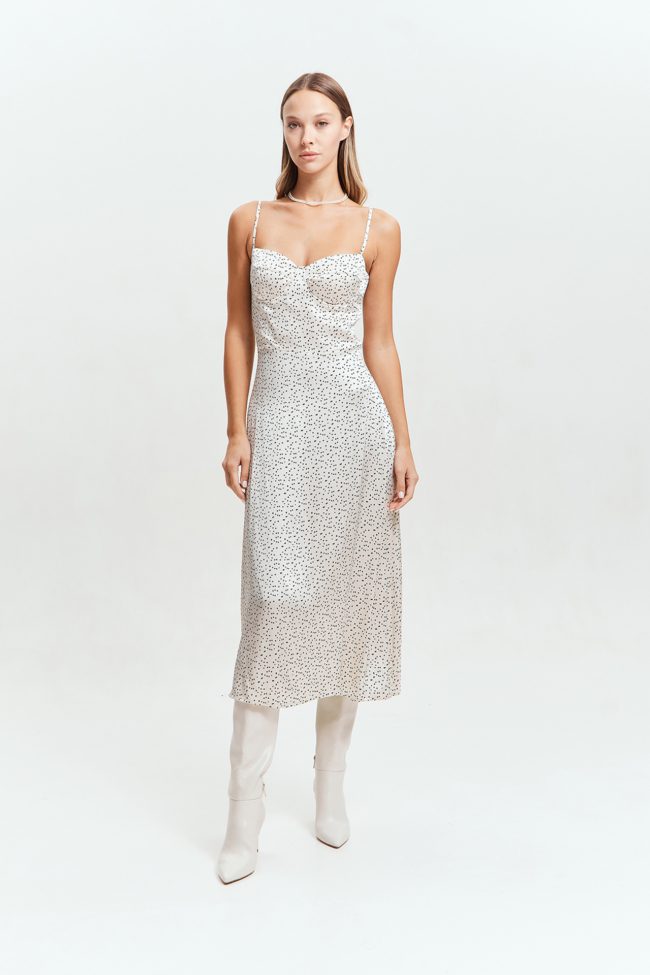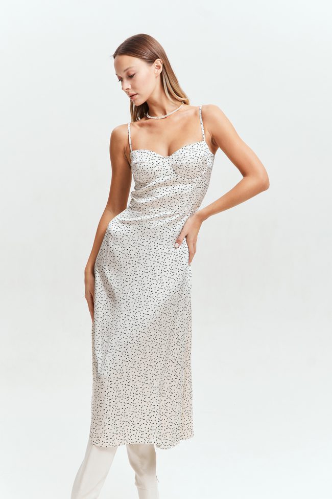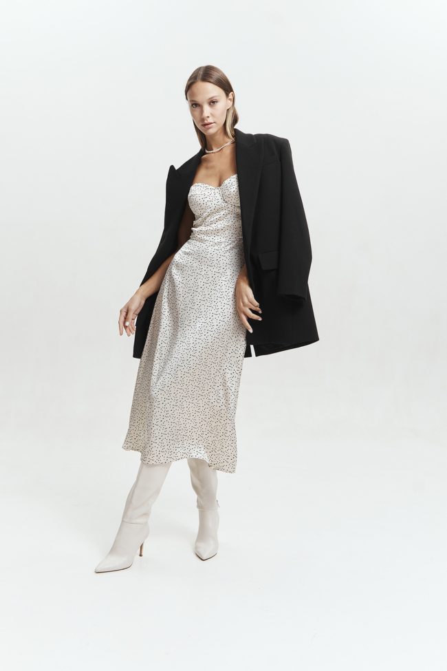В равной мере женственно и провокационно – в лучших традициях VERESK label. За первое отвечает игривый принт в горошек и длина миди, а на второе работают мягкие чашечки на косточках. Платье-бюстье дополнено тонкими лямками с фиксаторами, комфортной резинкой по спинке и молнией.