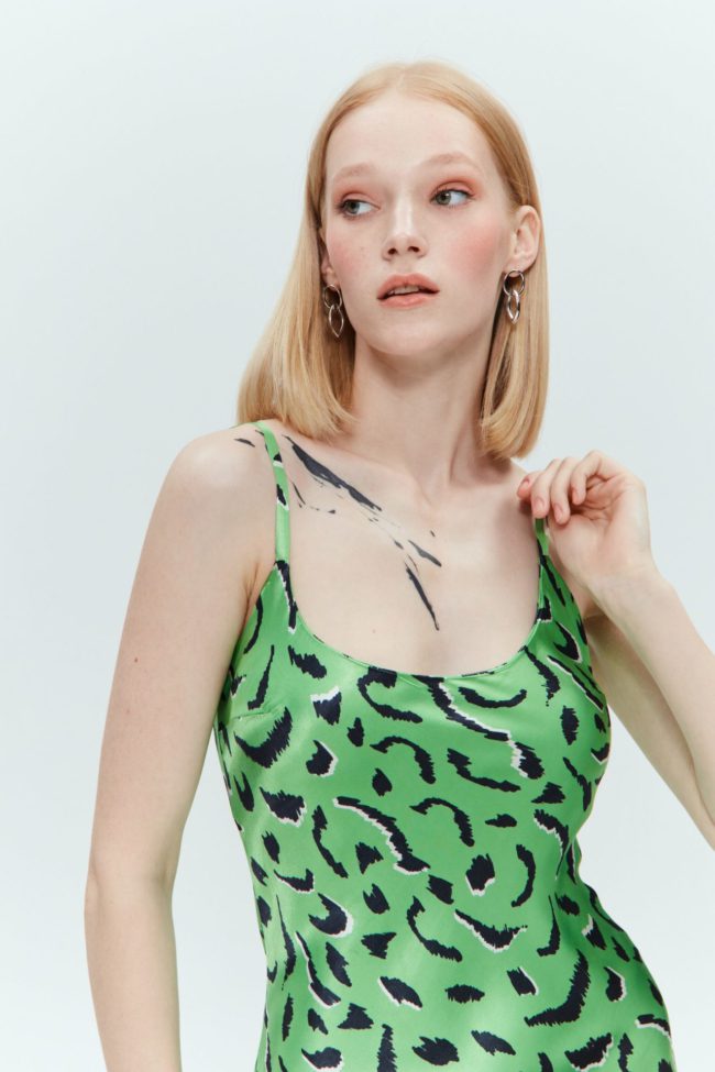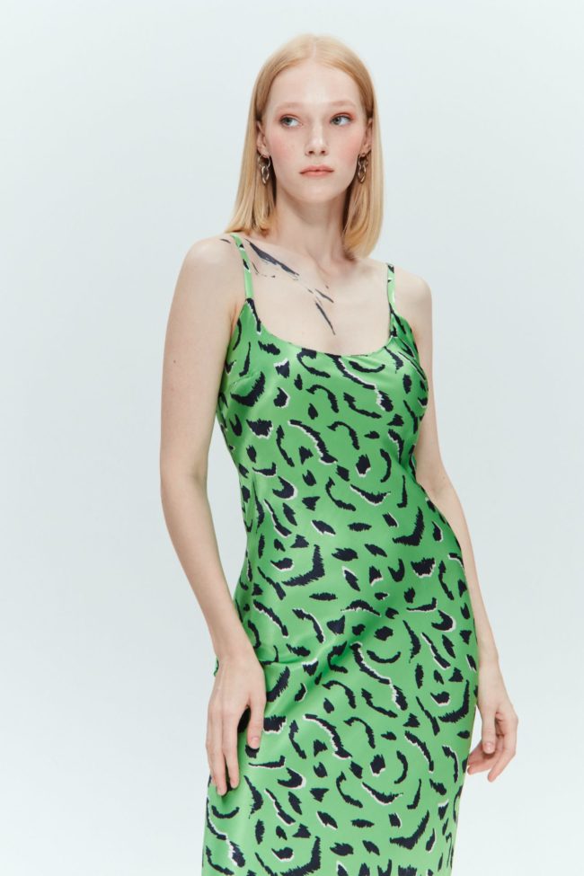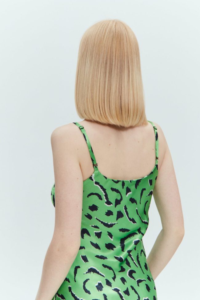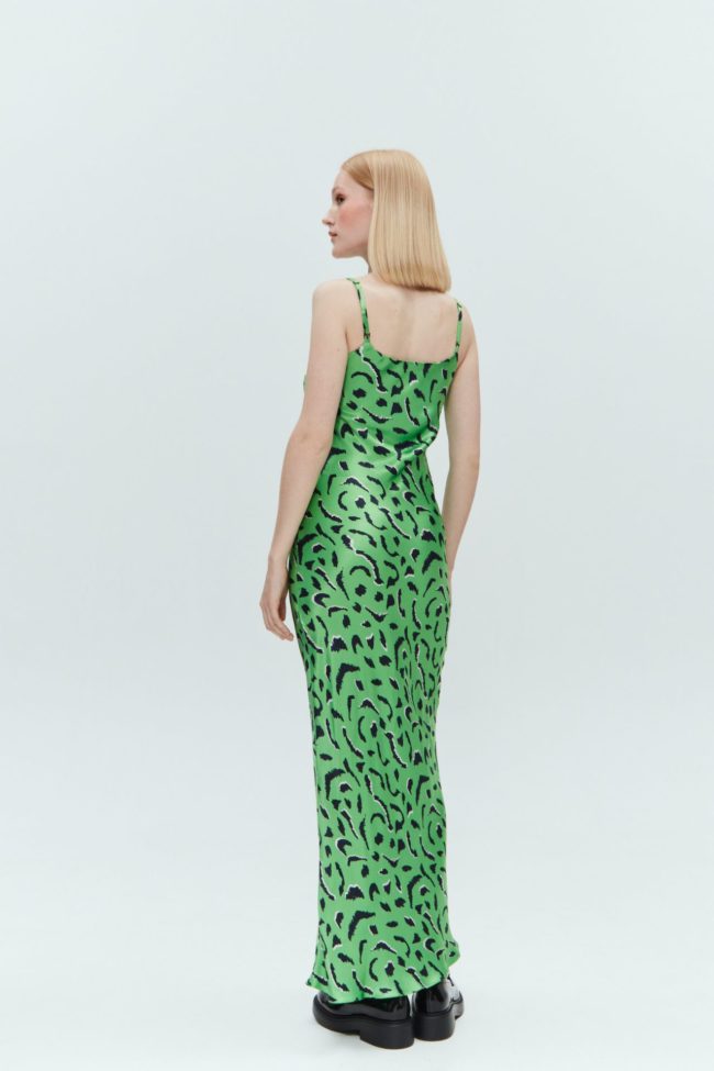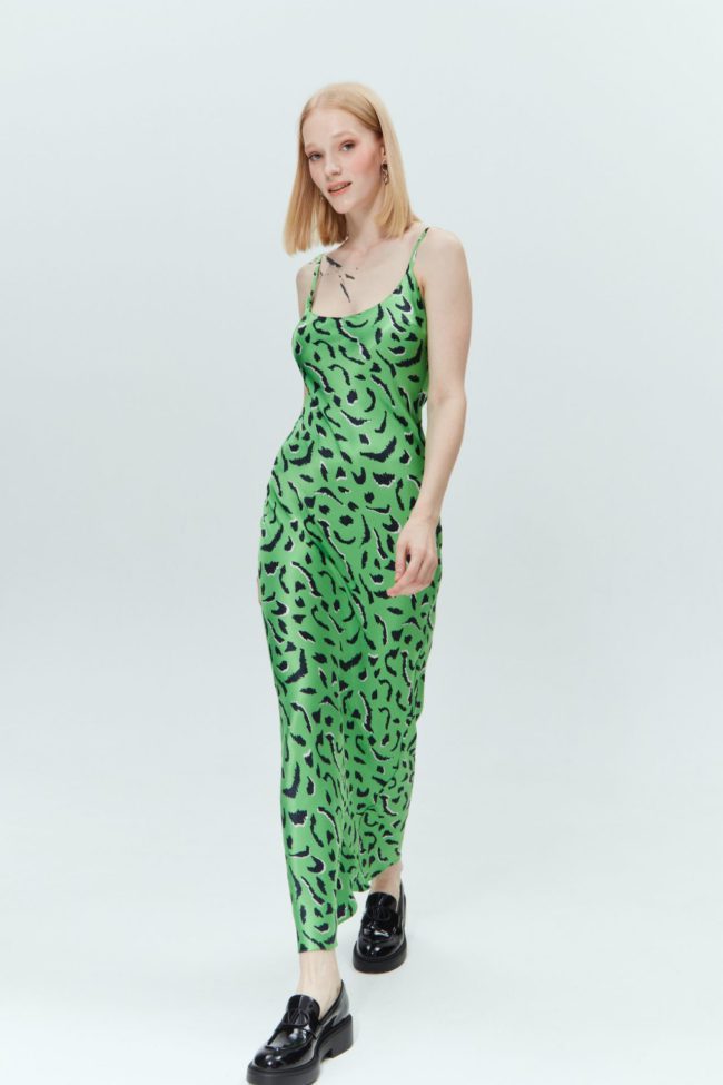 Базовое платье-комбинация с лаконичным силуэтом и эффектным принтом LEOPARD GREEN. Для пошива модели с узкими регулирующимися бретелями использовали мягкую струящуюся вискозу. Крой по косой красиво очерчивает силуэт и не сковывает шаг при ходьбе.