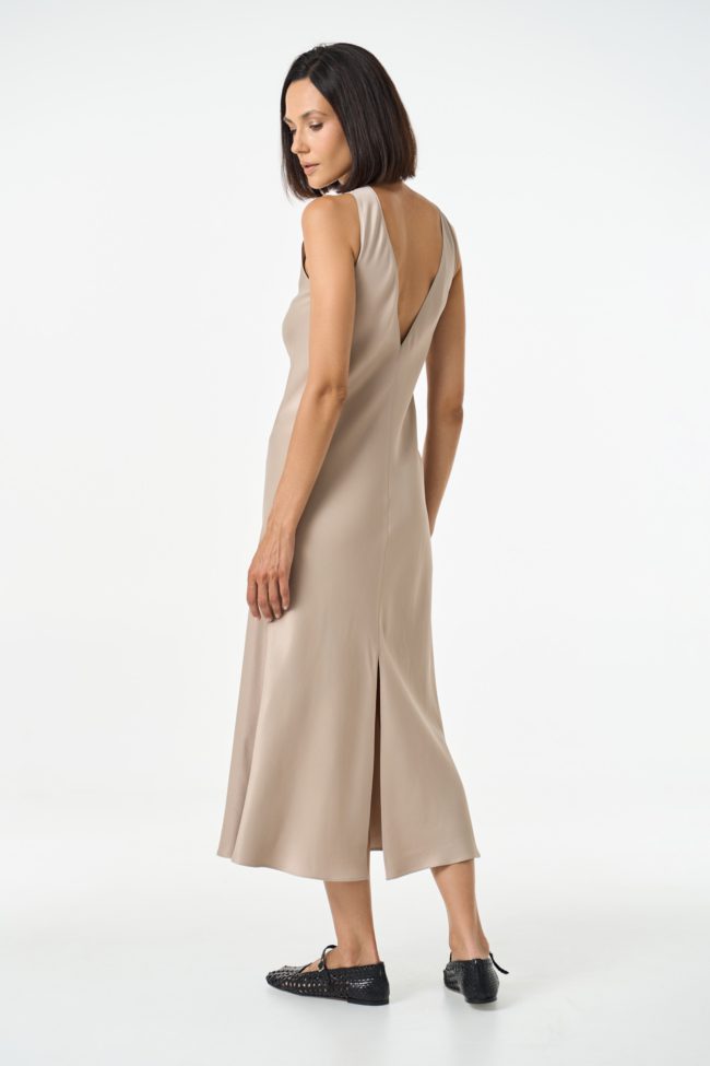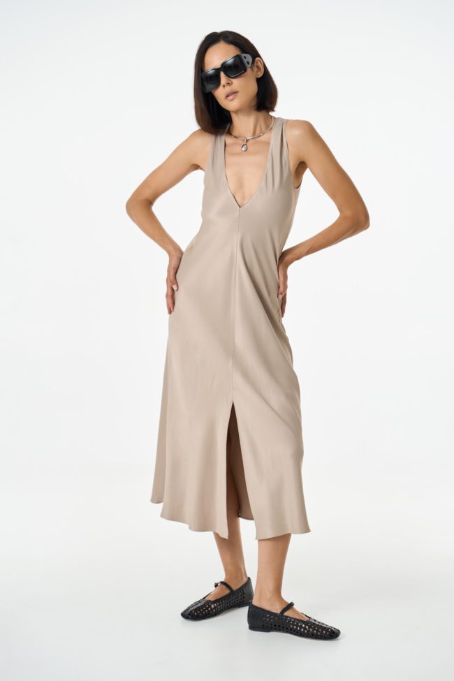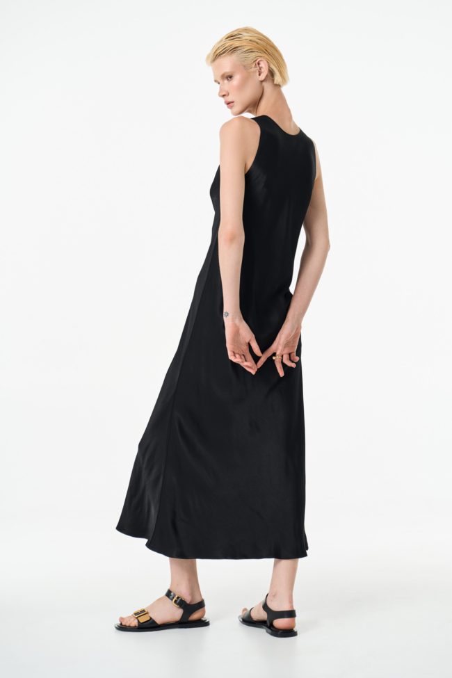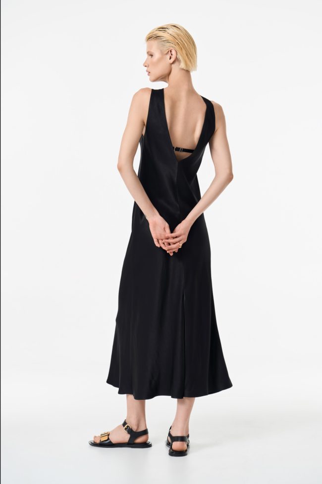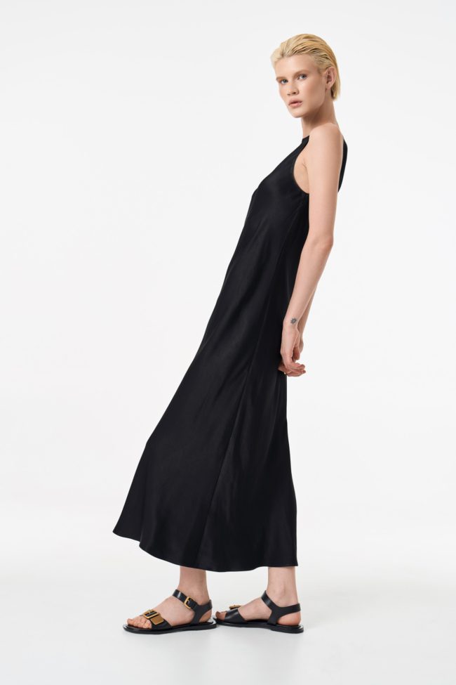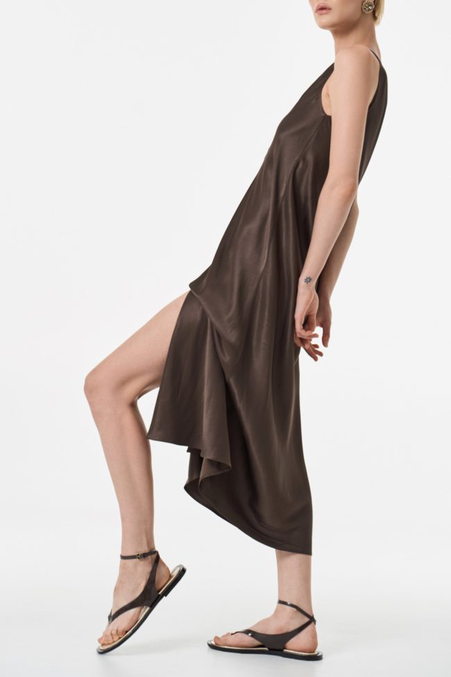 В названии платья DUAL скрывается задумка дизайнеров – создать платье, которое можно надевать двумя сторонами. Одна сторона – максимально базовая, вторая – более смелая, с глубоким клиновидным вырезом и разрезом посередине. Добиться эффекта двух платьев в одном позволяет крой по косой и отсутствие вытачек. Для пошива модели использовали скользящую ткань из шелковистой вискозы, которая эффектно струится в движении, очерчивая силуэт.