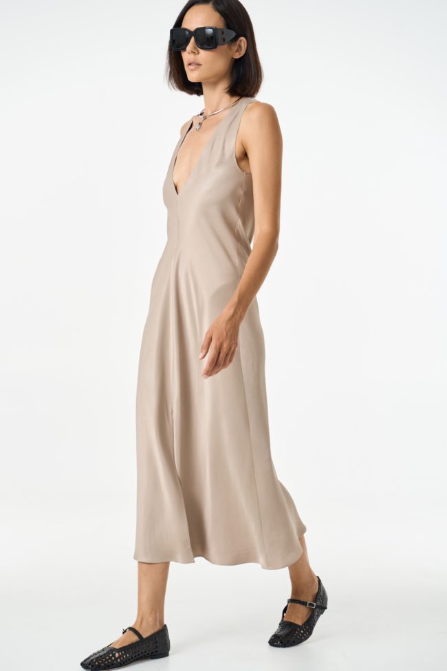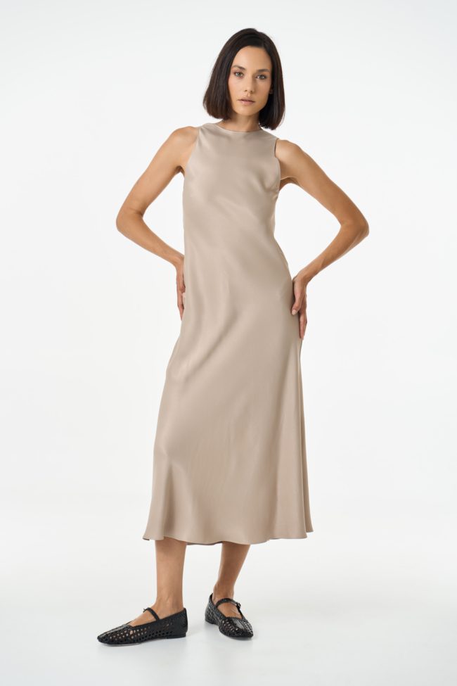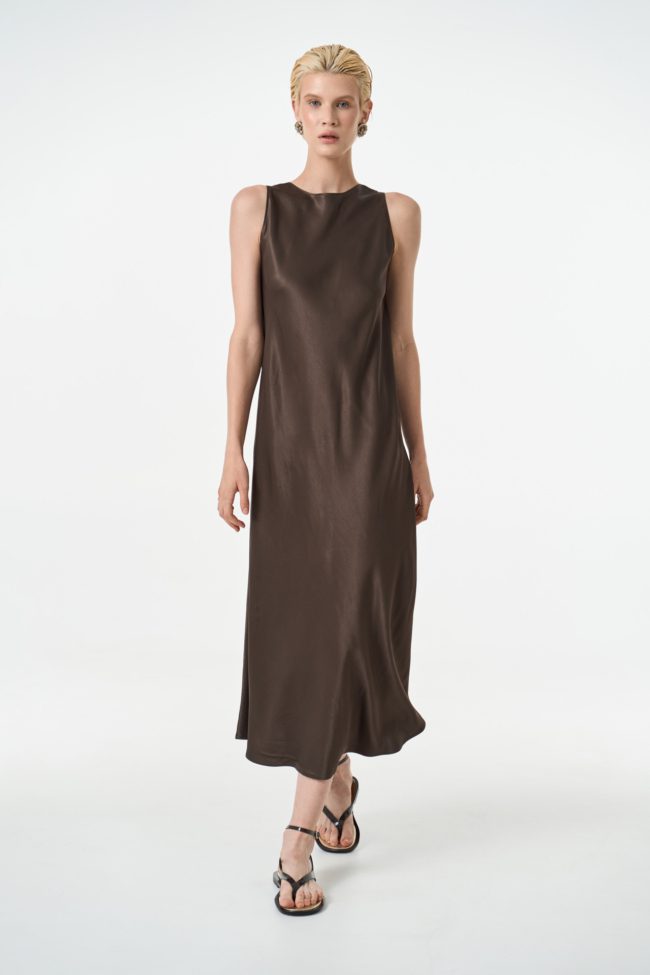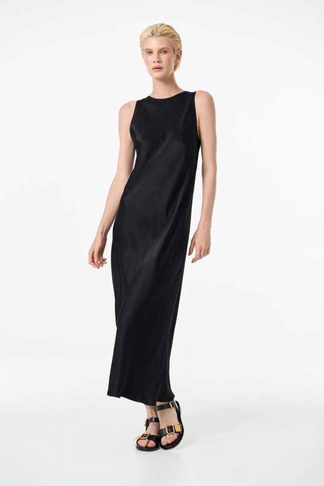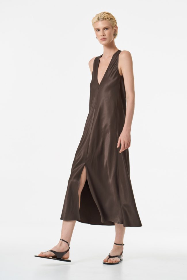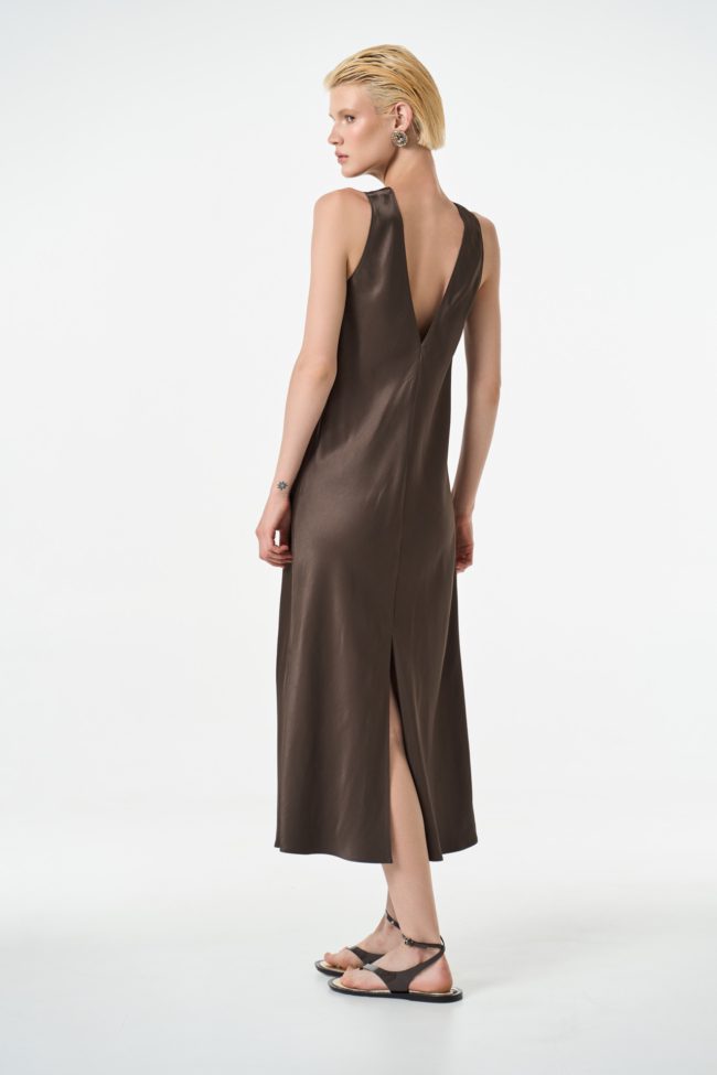 В названии платья DUAL скрывается задумка дизайнеров – создать платье, которое можно надевать двумя сторонами. Одна сторона – максимально базовая, вторая – более смелая, с глубоким клиновидным вырезом и разрезом посередине. Добиться эффекта двух платьев в одном позволяет крой по косой и отсутствие вытачек. Для пошива модели использовали скользящую ткань из шелковистой вискозы, которая эффектно струится в движении, очерчивая силуэт.