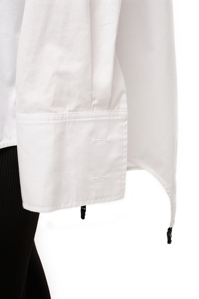 Белый цвет придаёт образу чистоту и универсальность: рубашку можно носить как самостоятельную вещь, заправив в брюки или юбку, либо в составе костюма из линии Black Tie. Она одинаково гармонично смотрится с классическими брюками, джинсами и даже мини-юбкой — всё зависит от настроения и контекста.