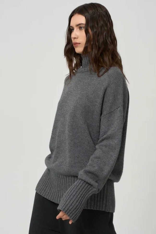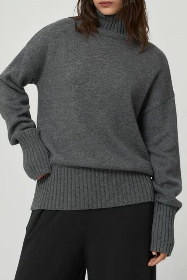 Свитер объёмного кроя, с высокой горловиной и длинными манжетами, что делает его тёплым, комфортным и выразительным. Универсальные цвета хорошо сочетаются с базовыми элементами гардероба — джинсами, брюками, юбками и верхней одеждой. Идеальный вариант для холодного сезона.