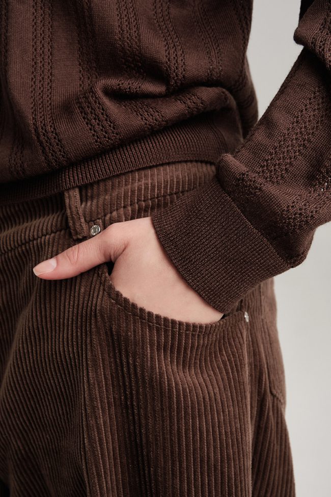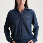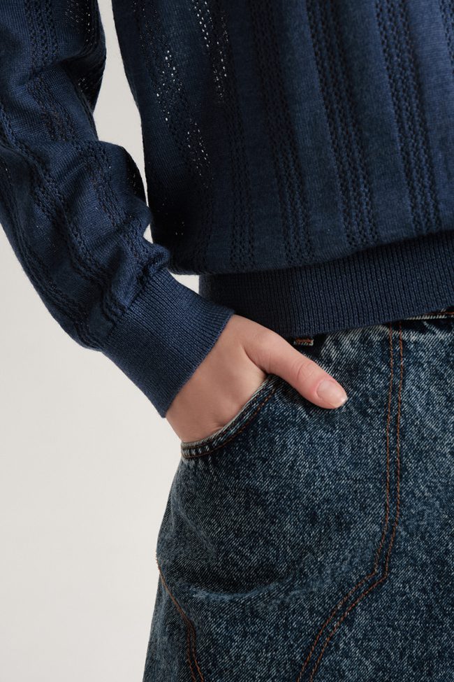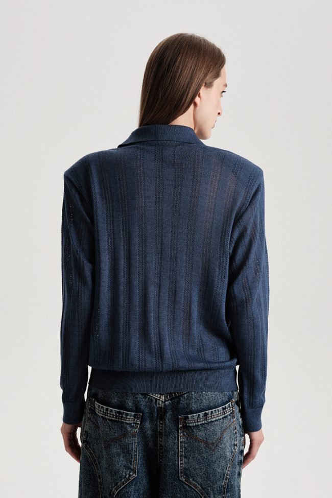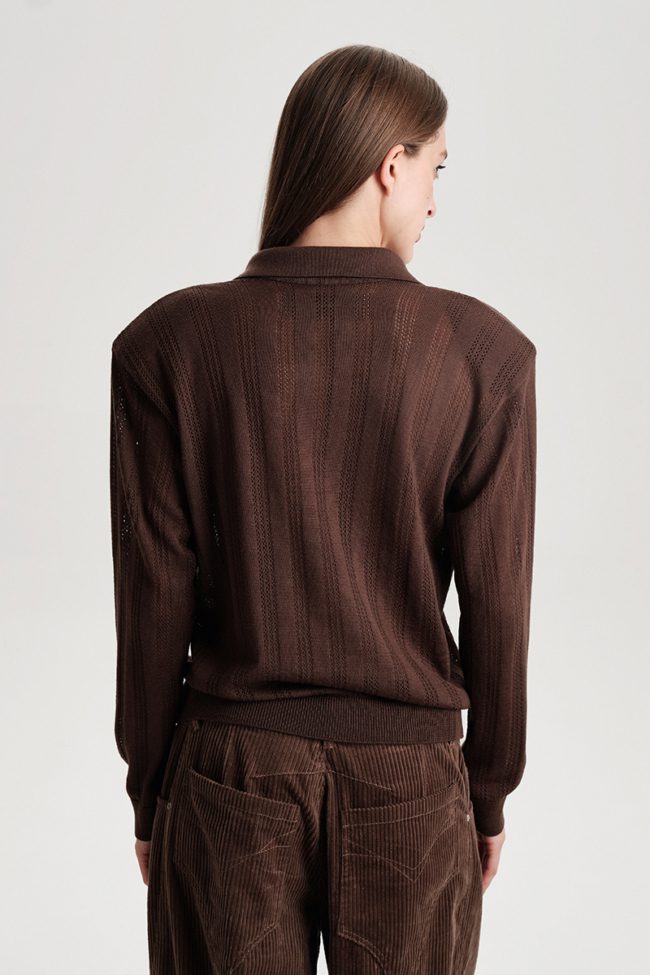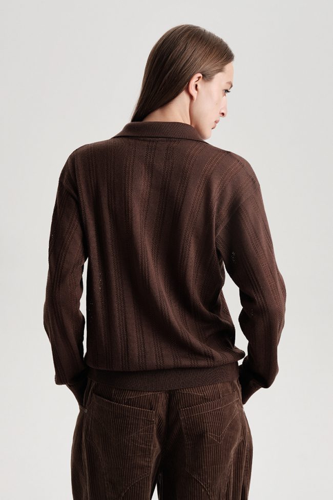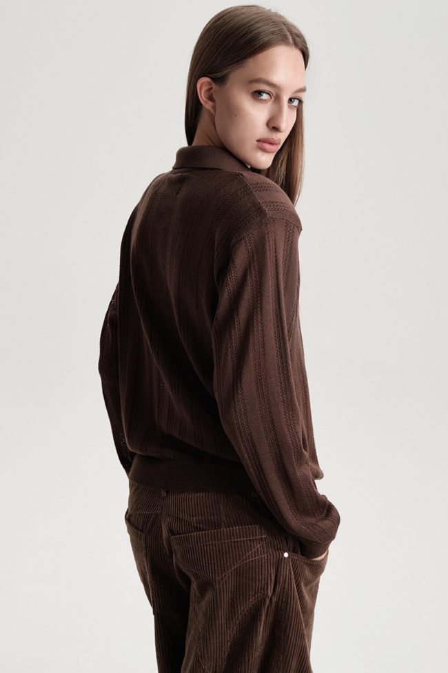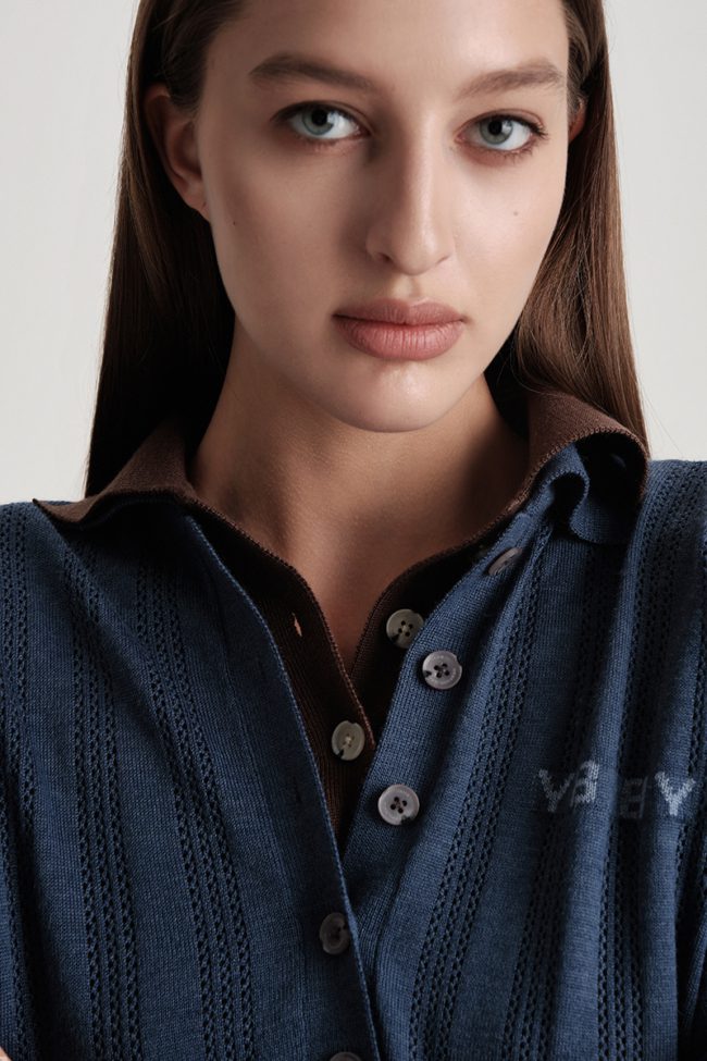 Воротник-поло — ключевая деталь дизайна. Он создаёт аккуратный, структурный акцент в зоне декольте и делает силуэт собранным. При этом выглядит современно, легко вписывается в городские образы и позволяет носить свитер как самодостаточную вещь, так и под жакеты и пальто.