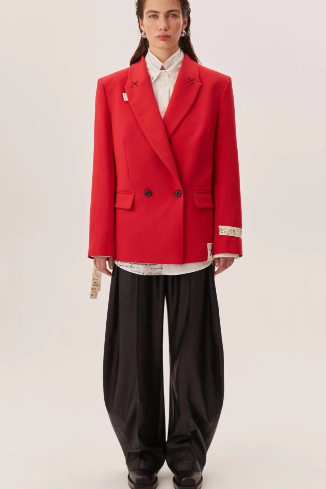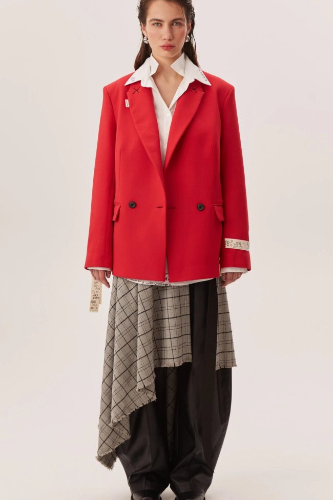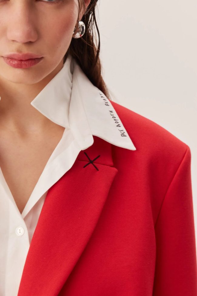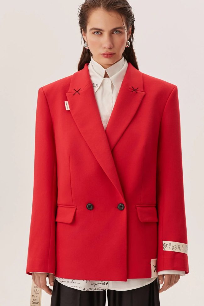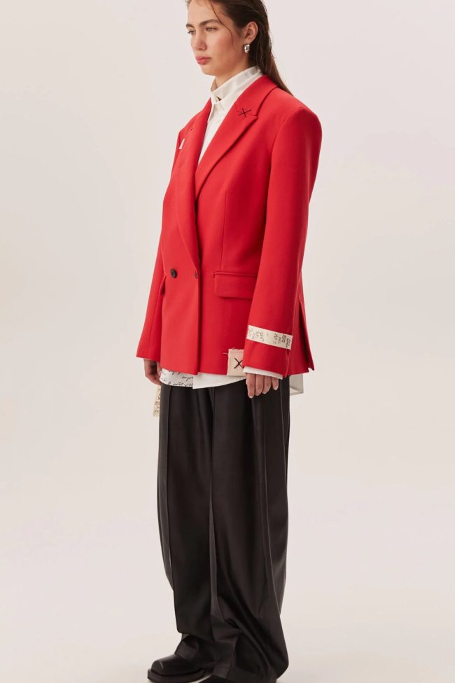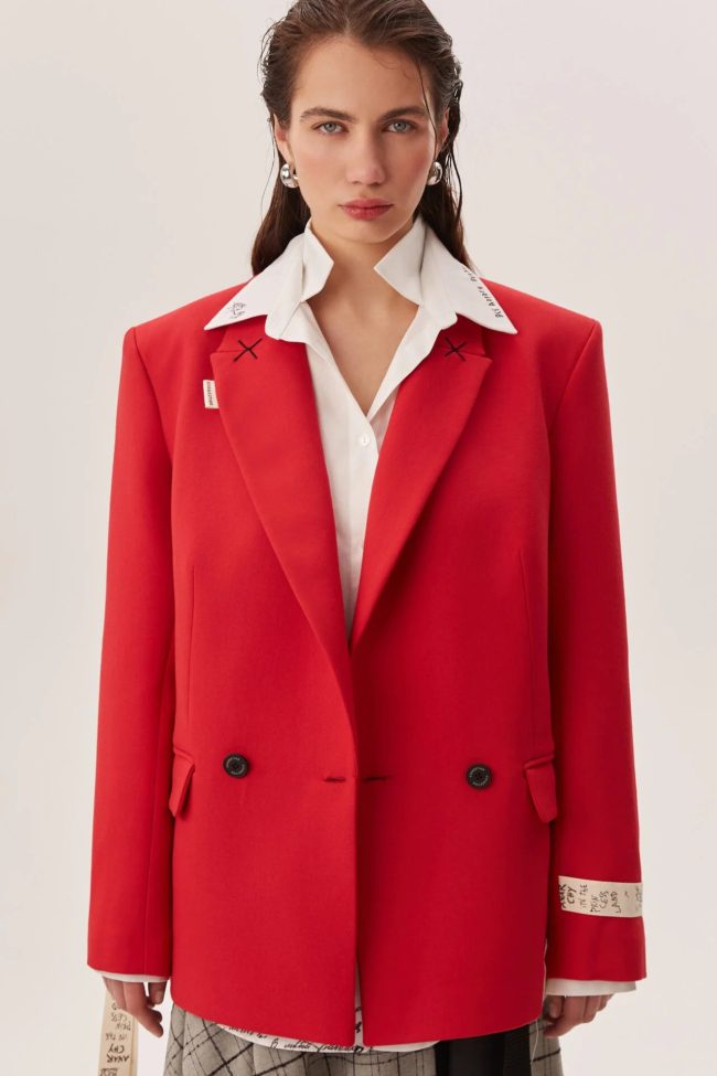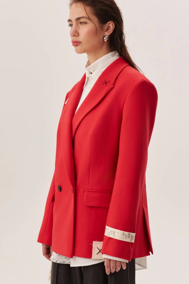 Красный цвет превращает жакет в акцентную вещь: он становится центральным элементом образа — достаточно сочетать с нейтральными оттенками, чтобы создать впечатляющий лук, либо комбинировать с контрастом для выразительности.