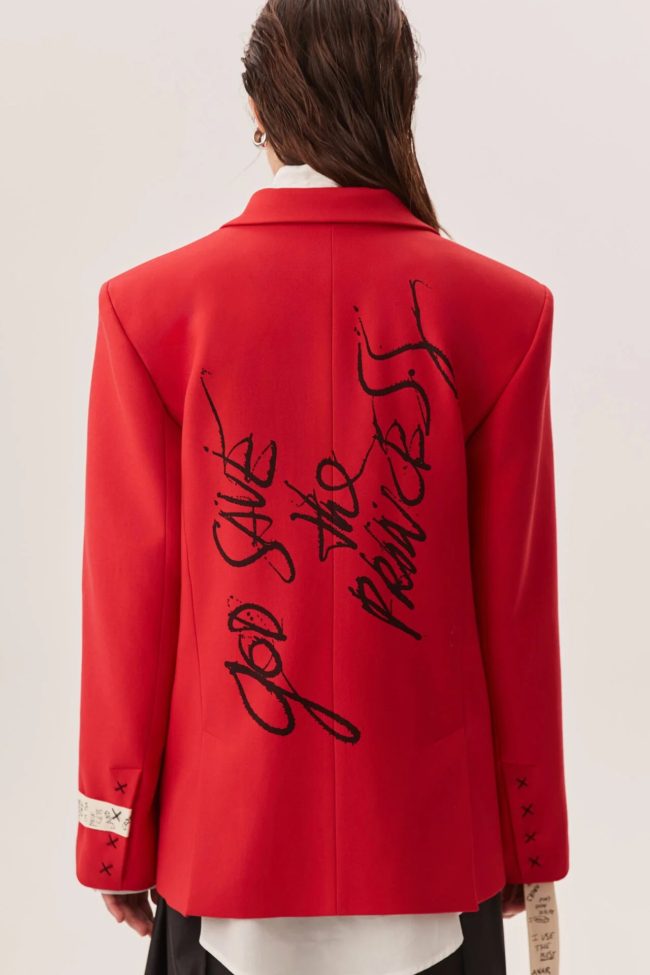 Двубортная модель из костюмной вискозы с авторским принтом GOD SAVE THE PRINCESS в красном цвете. Актуальный свободный силуэт с объемной, чуть спущенной линией плеча, удлинённый крой, английский воротник, прорезные карманы.