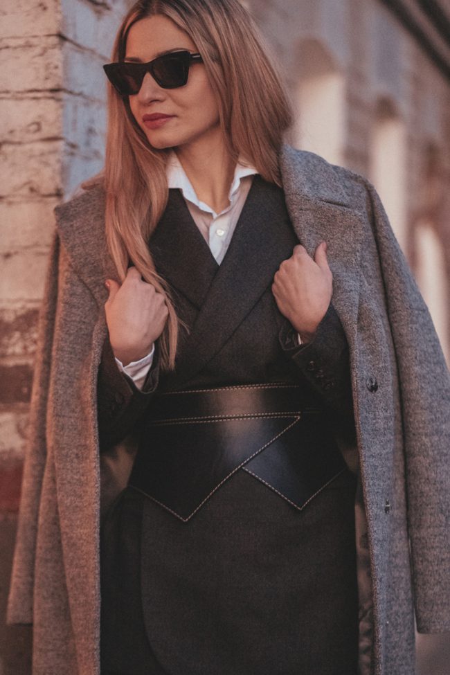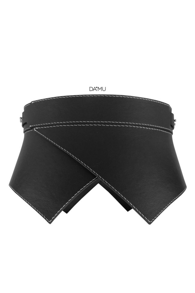 Стильный акцентный ремень‑баска от бренда DA’MU. Изготовлен из натуральной кожи с выразительными заострёнными углами и контрастной отделкой. Идеальный аксессуар для создания элегантного силуэта и выразительного образа.