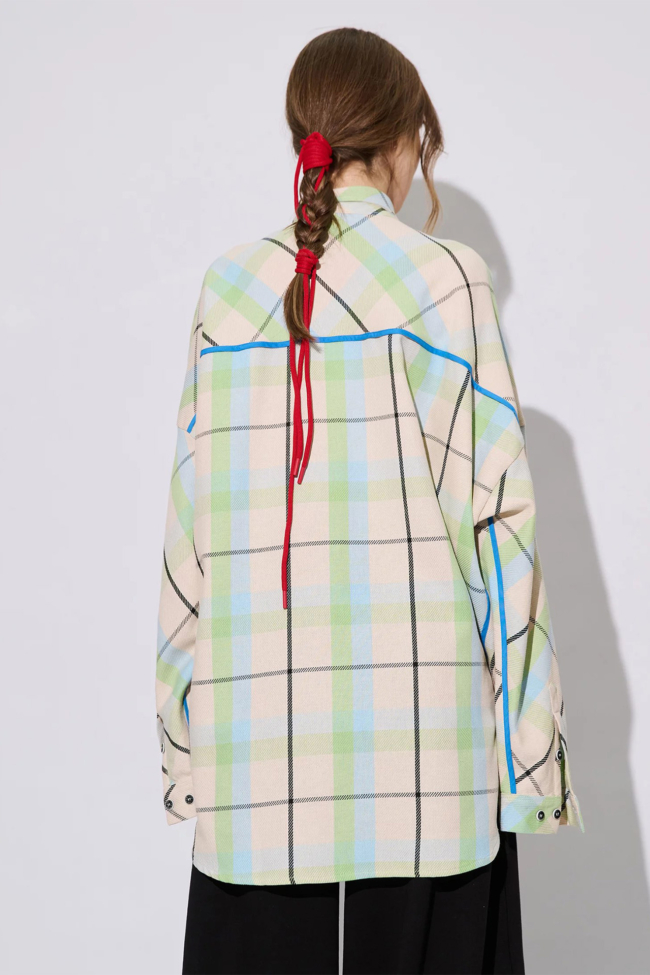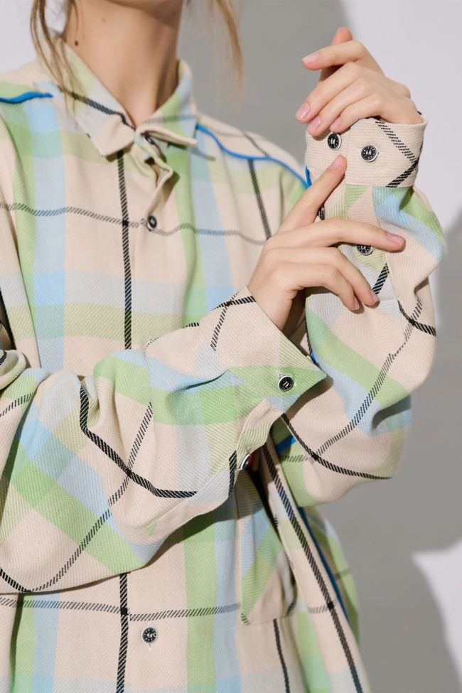 Рубашка серо-бежевого цвета с зелено-голубыми акцентными полосками свободного кроя, с геометрическим принтом и авторской брошью как нельзя кстати пригодится при составлении сложных образов и отлично сработает на ваше утепление – ведь это 100% хлопок. Забудьте о синтетике! Спущенная линия плеча и воротник с острыми углами непринуждённо подчеркнут ваш расслабленный вайб. В такой невозможно остаться незамеченным! Рубашка идеальна для встреч с друзьями и просто повседневных дел. Легко комбинируется с пиджаками, худи, брюками или джинсами, создавая стильный casual-образ.