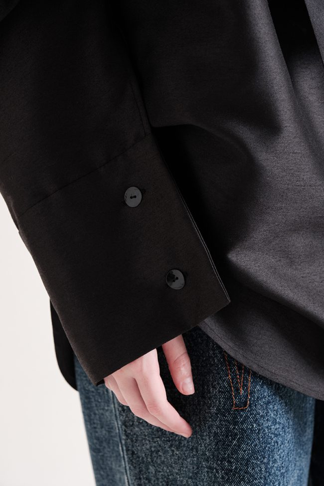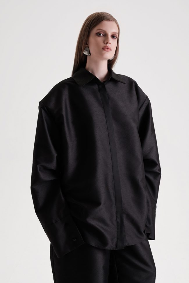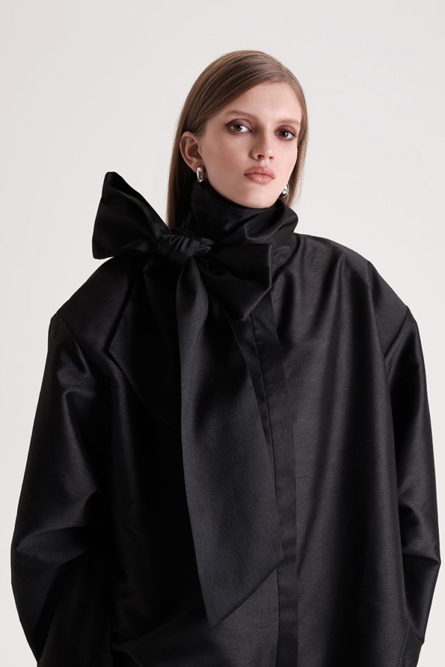 Структурная рубашка Grand Cru с бантом чёрного цвета — акцентная модель, которая создаёт чистый, собранный силуэт благодаря плотной ткани, идеально держащей форму. Универсальный оверсайз-крой и трансформируемый пояс-бант позволяют легко менять характер образа: от строгого и минималистичного до более драматичного и модного. Рубашка подходит для работы, мероприятий, съёмок и повседневных выходов, сразу добавляя образу продуманности и визуального акцента.