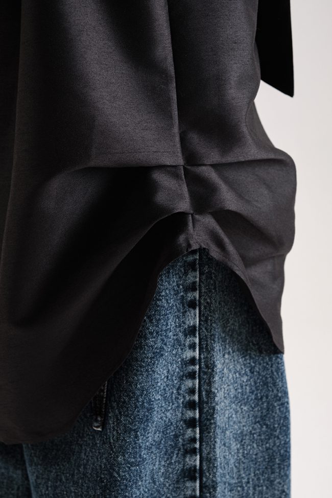 Главная особенность — пояс-бант, который можно завязывать двумя способами: на шее или на талии. Благодаря этому рубашка с бантом чёрного цвета трансформируется под разные задачи. Если завязать бант на талии — акцент смещается на силуэт; если на шее — образ становится более графичным и драматичным. Такая вариативность делает модель универсальной для съёмок, ужинов, деловых выходов и повседневных образов.